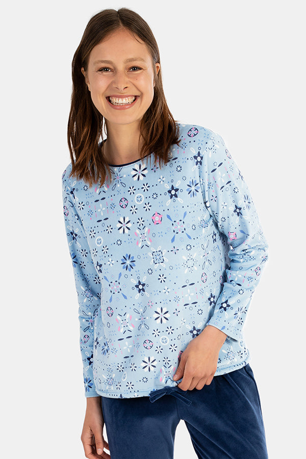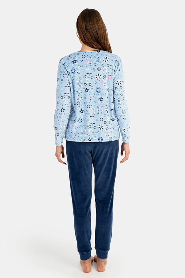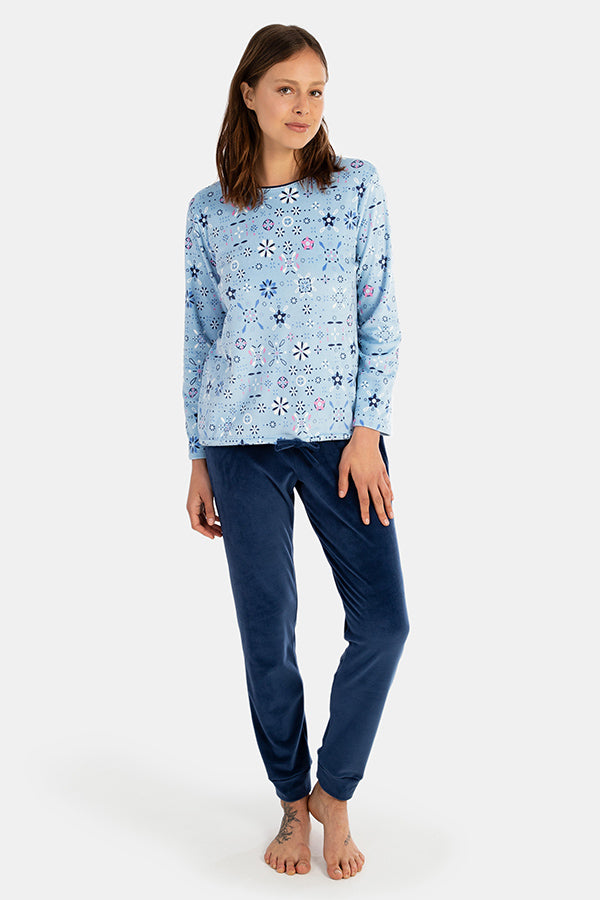 Pijama de mujer en tejido de punto de algodón, compuesto por camiseta de manga larga con estampado fantasía 'all over', y cuello redondo con vivo a contraste en azul. Pantalón estrecho en azul liso con bolsillos laterales. Tiene goma en la cintura.