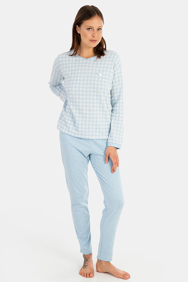 Pijama de mujer, compuesto por camiseta en tejido Jacquard Vichy, manga larga, cuello y puños en contraste. Pantalón largo en tejido Interlock y goma en cintura