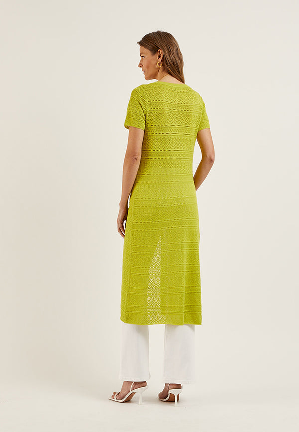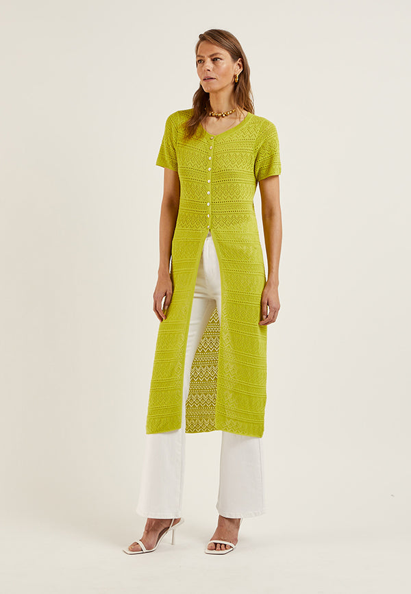 Top de punto largo con calados. Escote redondo. Mangas cortas anchas. Abotonado hasta cintura.