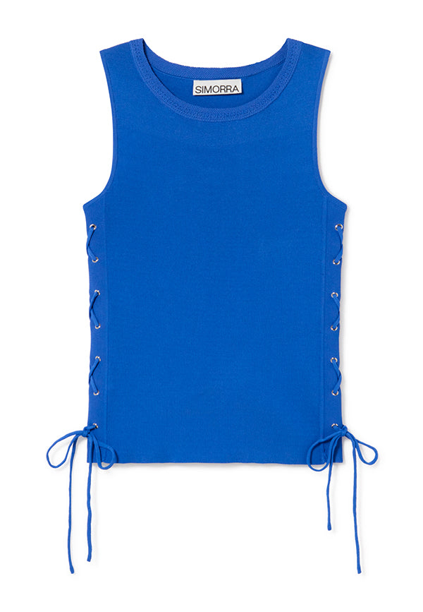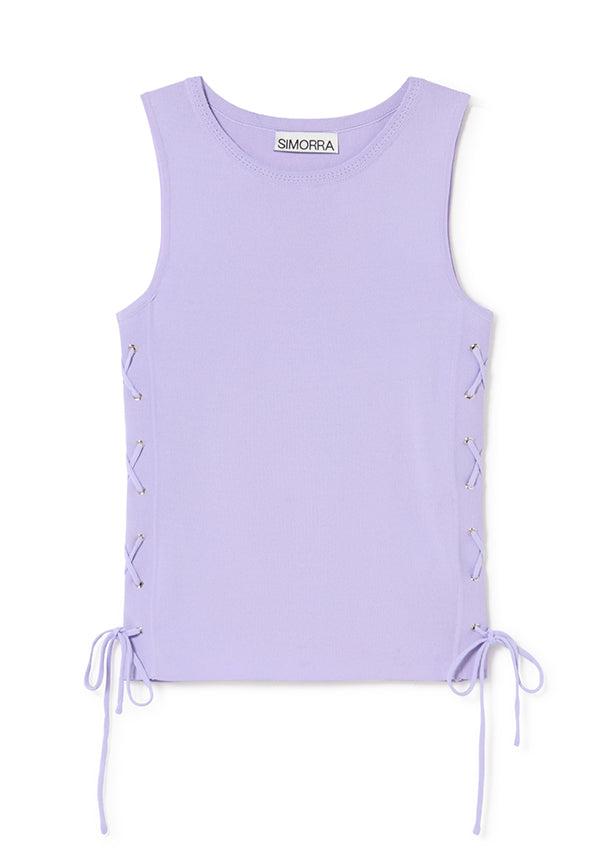Top de punto con escote redondo sin mangas. Detalle de eyelets con cinta en los laterales.