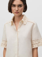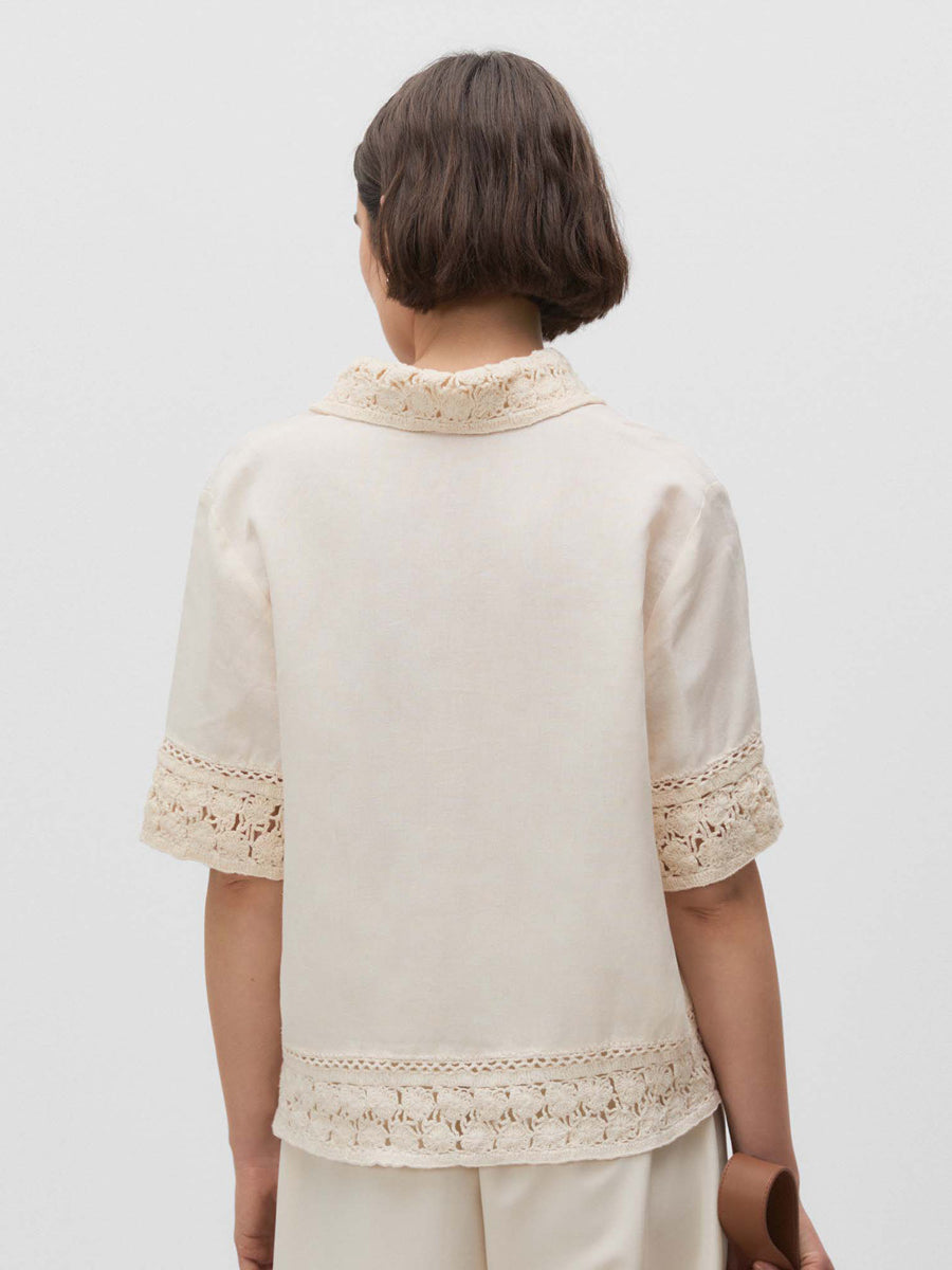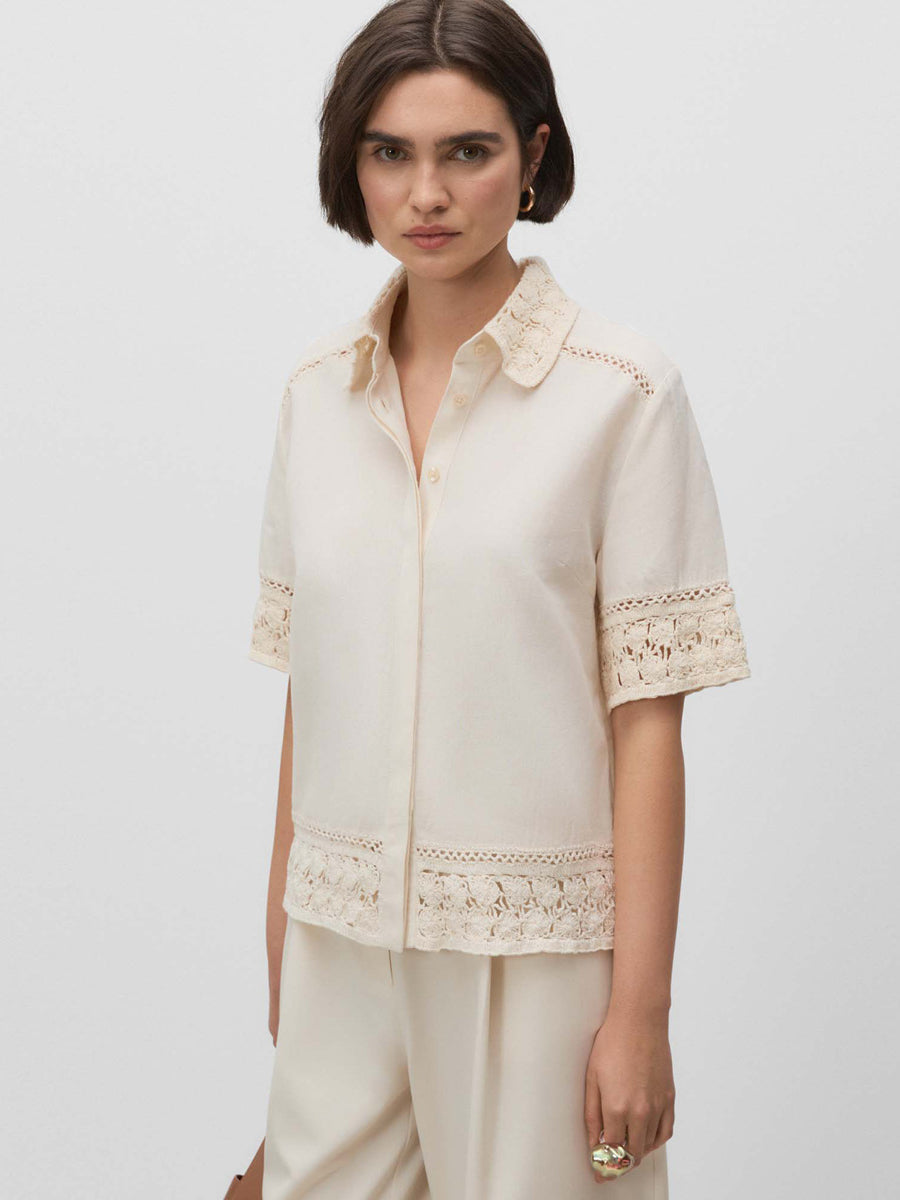 Blusa con cuello camisero y manga corta. Detalles de pasamanería y tejido tipo crochet. Cierre mediante botones ocultos por tapeta.