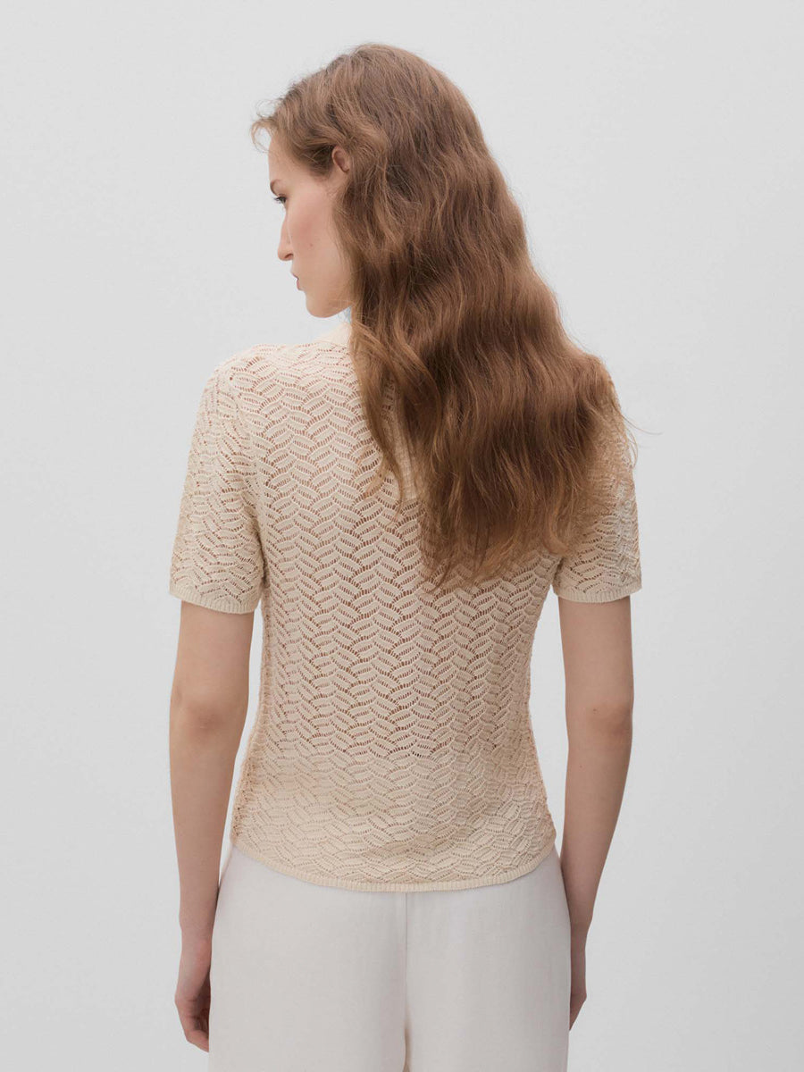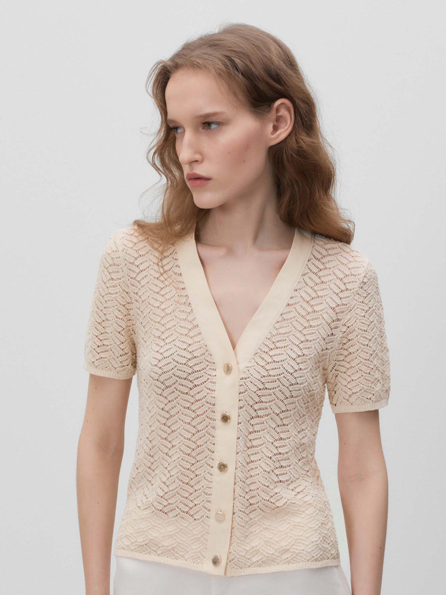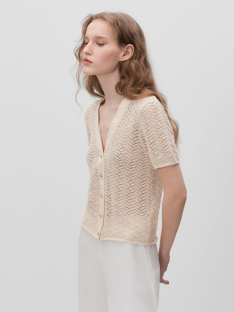 Top de punto calado con escote V y manga corta. Cierre mediante botonadura frontal.