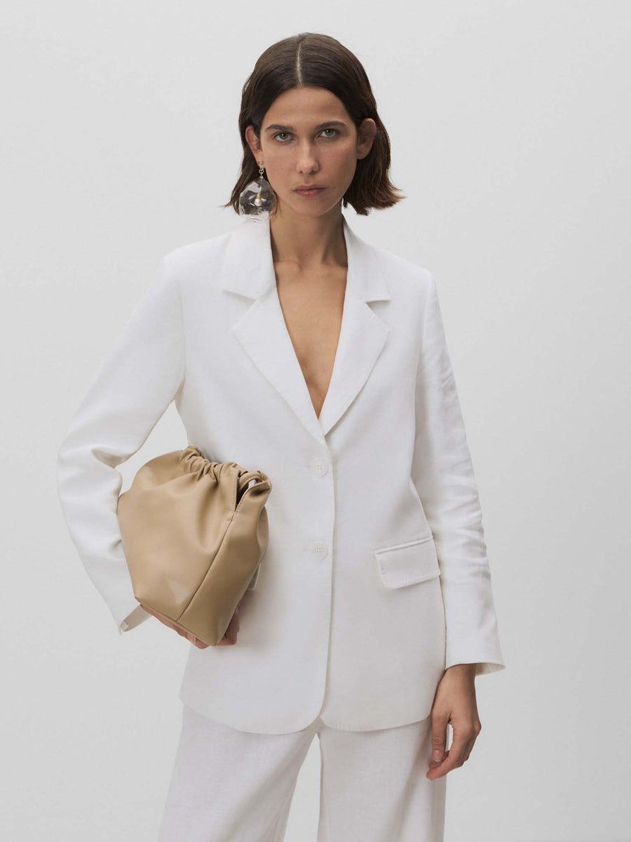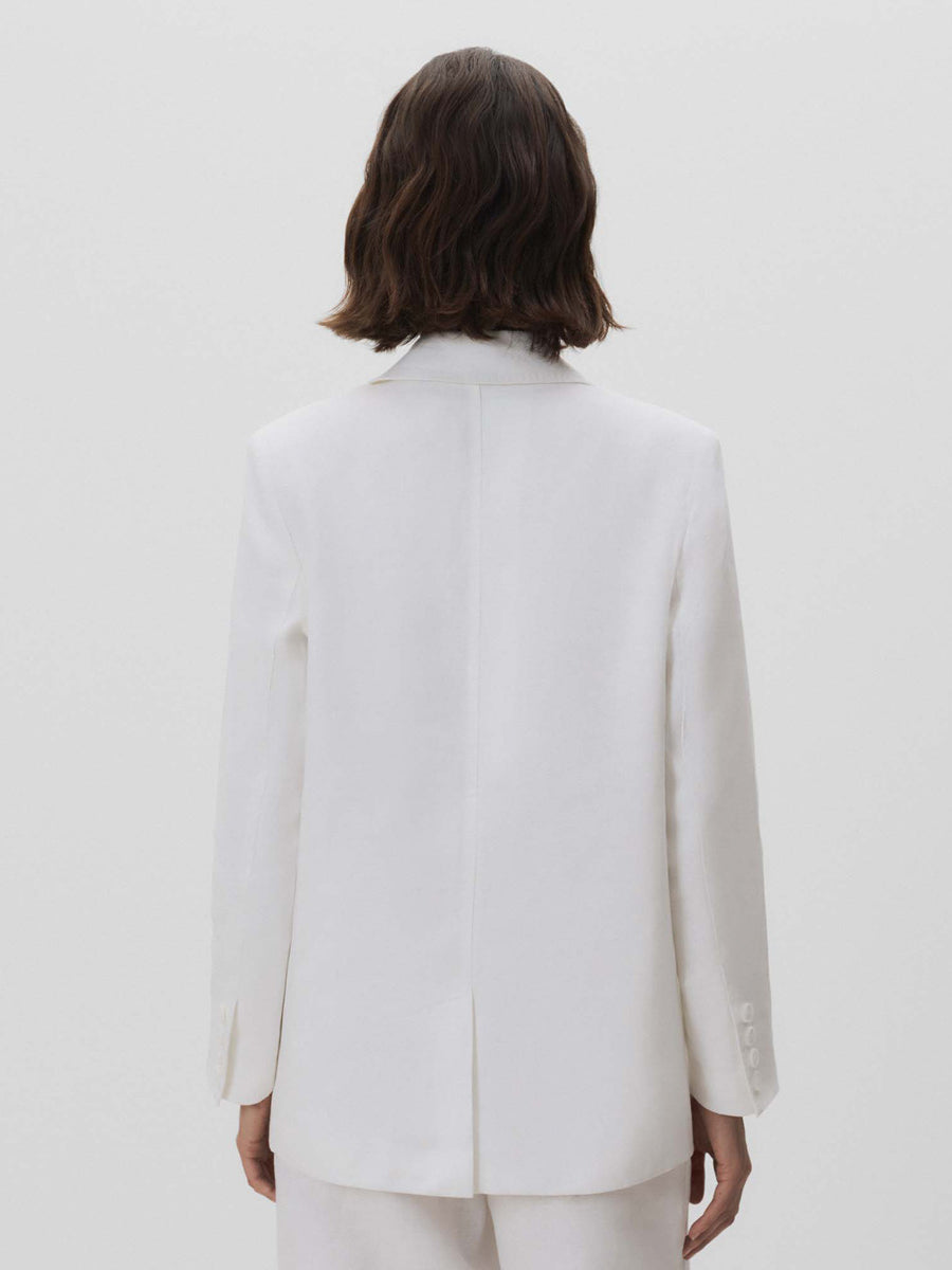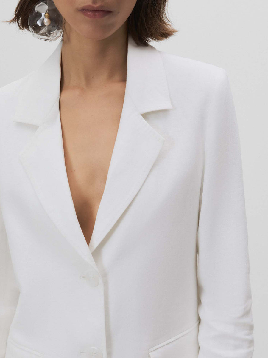 Americana de lino con escote cruzado. Cuello con solapa de pico. Cierre mediante doble botonadura con botones. Bolsillos con solapa. Forro al tono.