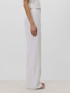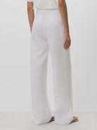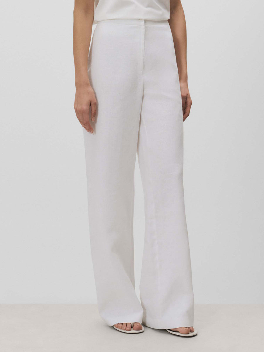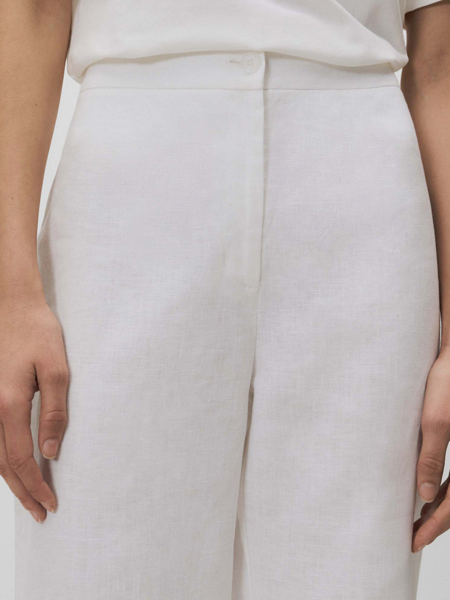 Pantalón recto de lino. Cinturilla con botón y cremallera oculta por tapeta.