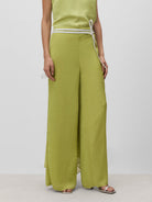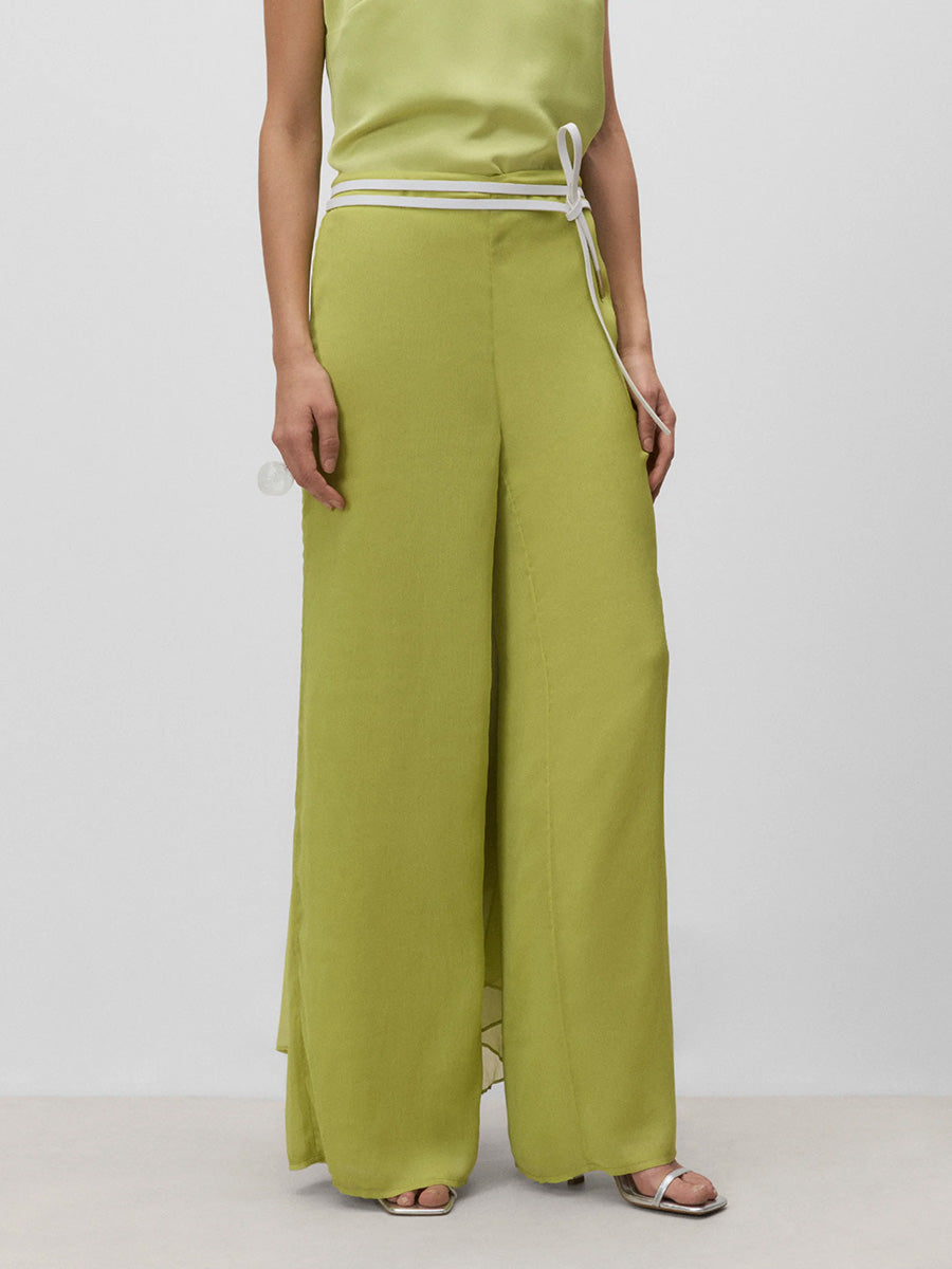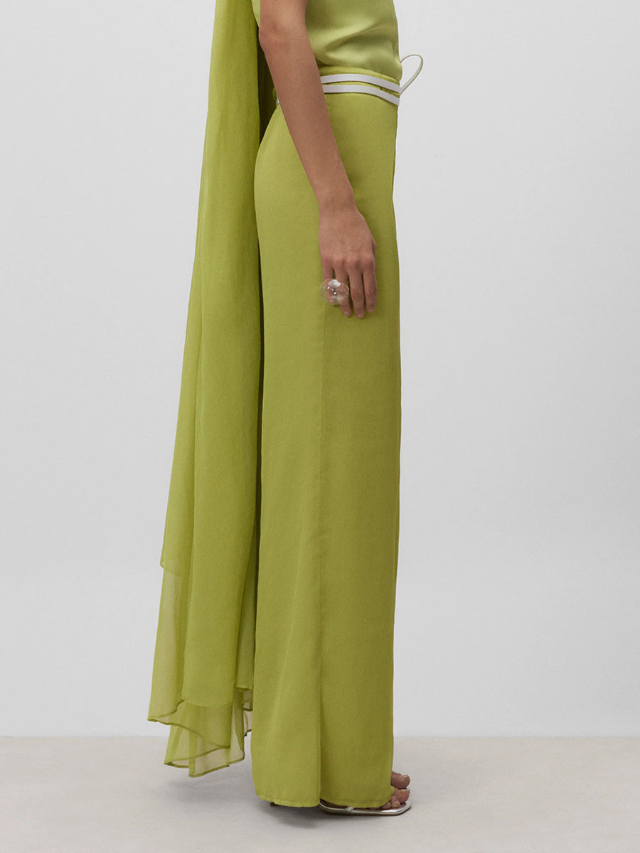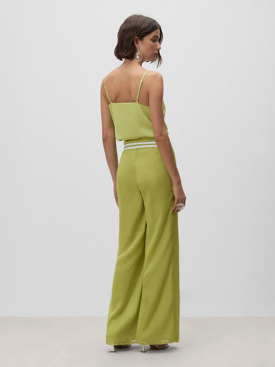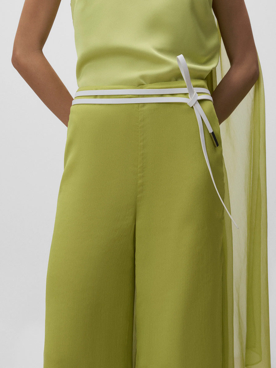 Pantalón Palazo de cintura alta y cierre mediante cremallera invisible en el lateral. Cinturilla ancha con tablillas tipo smoking.