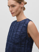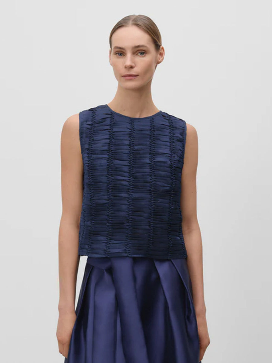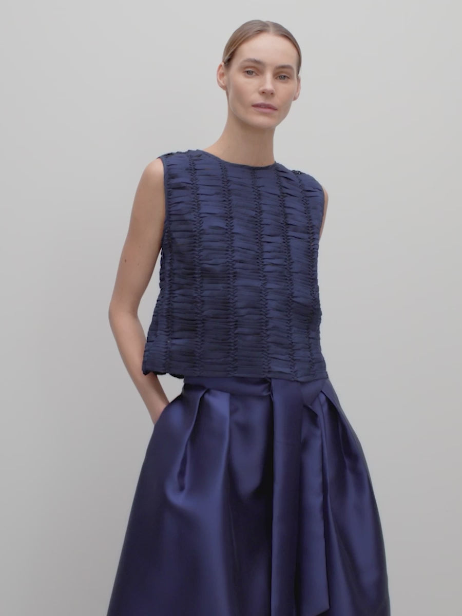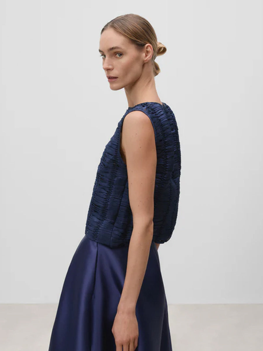Top escote caja, sin mangas y realizado con tiras entregiradas a mano. Cierre mediante obertura y botón forrado en espalda.