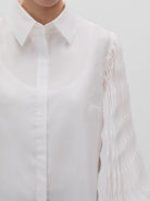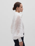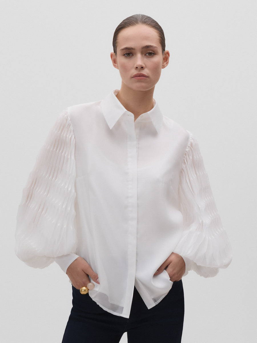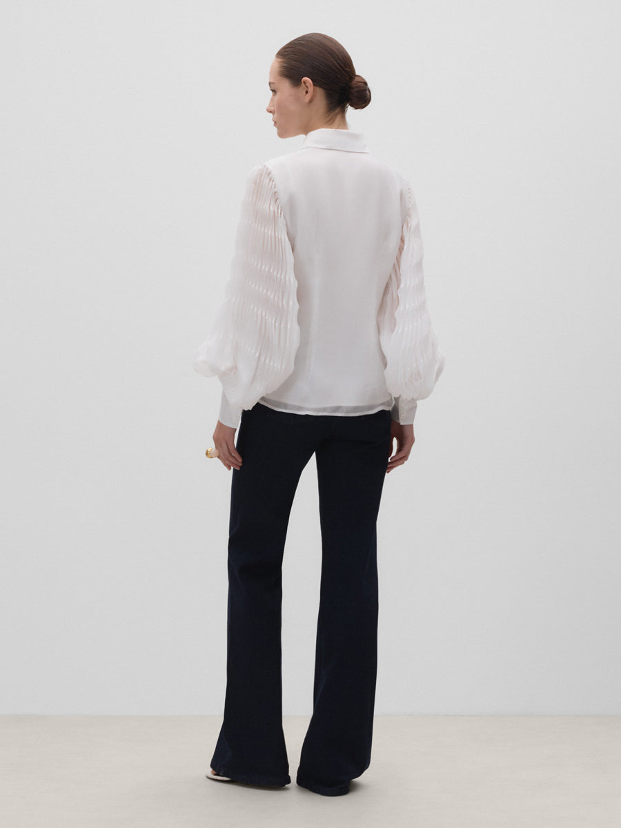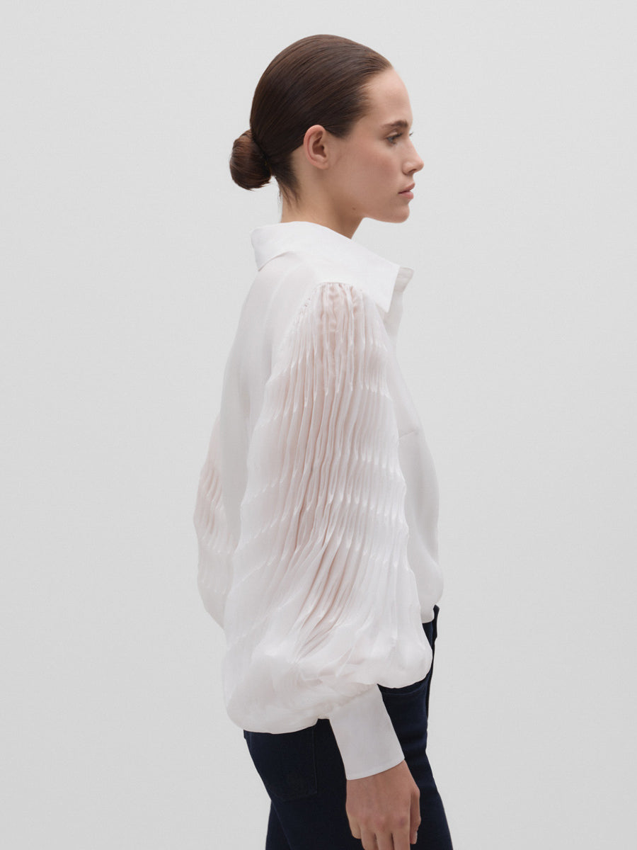 Blusa con cuello camisero y manga corta. Detalles de pasamanería y tejido tipo crochet. Cierre mediante botones ocultos por tapeta.