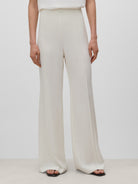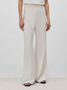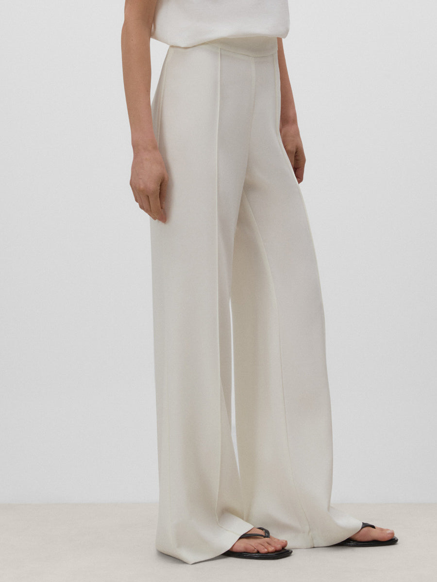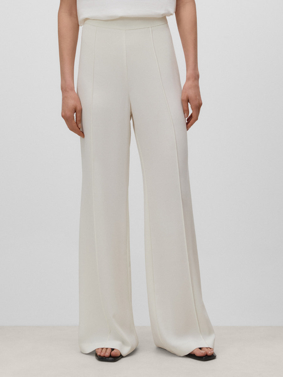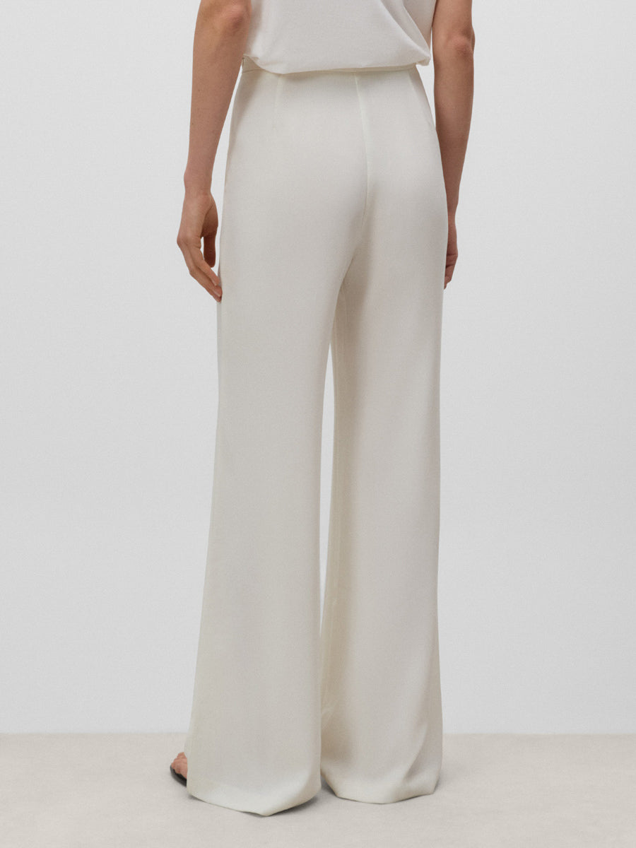 Pantalón crepé acampanado y cinturilla ancha. Cierre mediante cremallera invisible en el lateral.