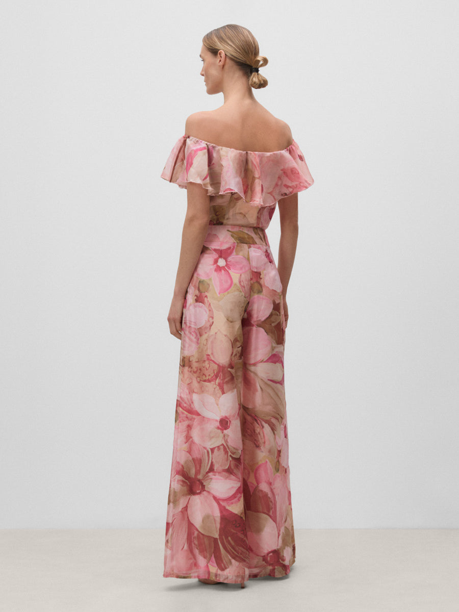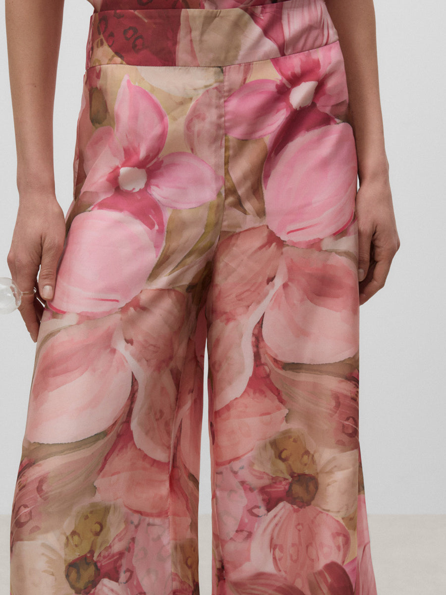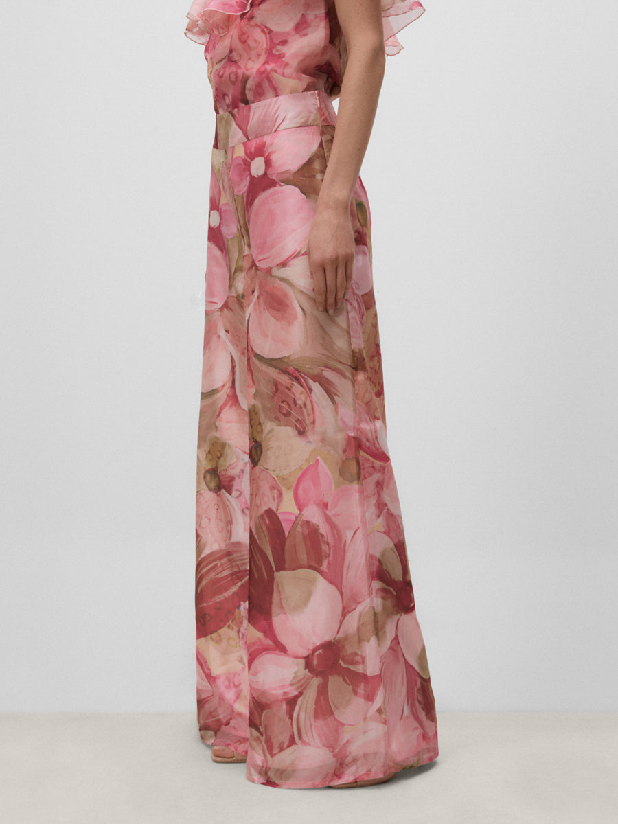 Pantalón palazzo de cintura alta con cinturilla. Cierre mediante cremallera invisible lateral.