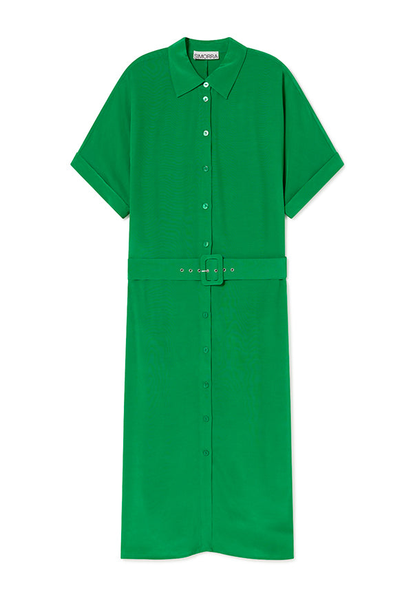 Vestido midi camisero de hombro caído y manga corta. Cierre mediante botonadura frontal. Cinturón del mismo tono.