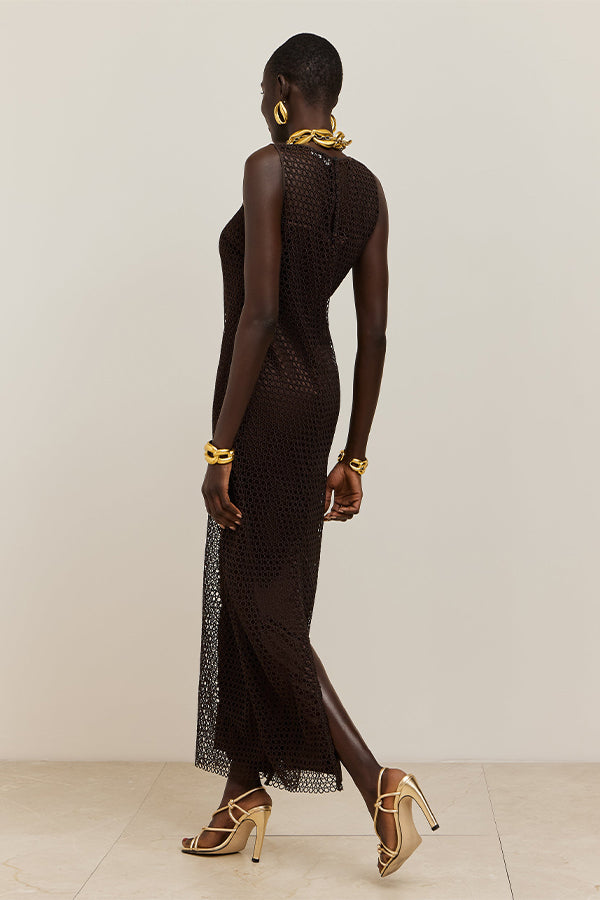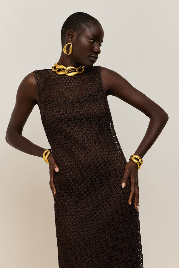Vestido de guipur sisado con escote caja. Forro cosido en prenda con escote corazon. Cerrado mediante cremallera invisible en espalda y botón con obertura.