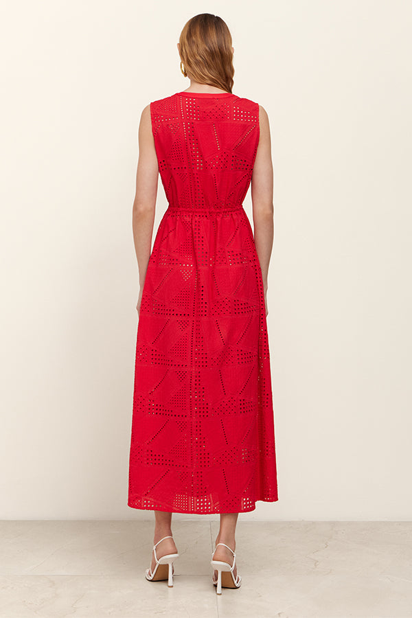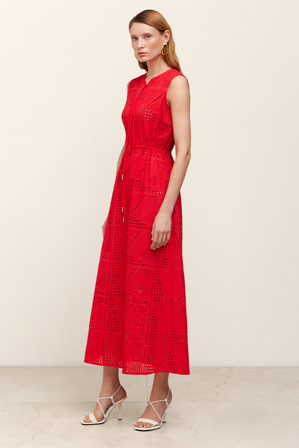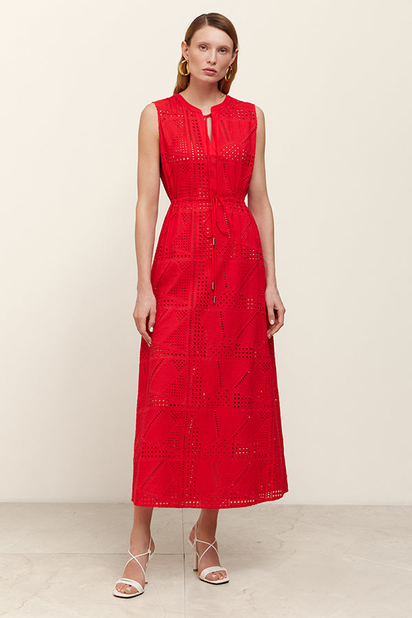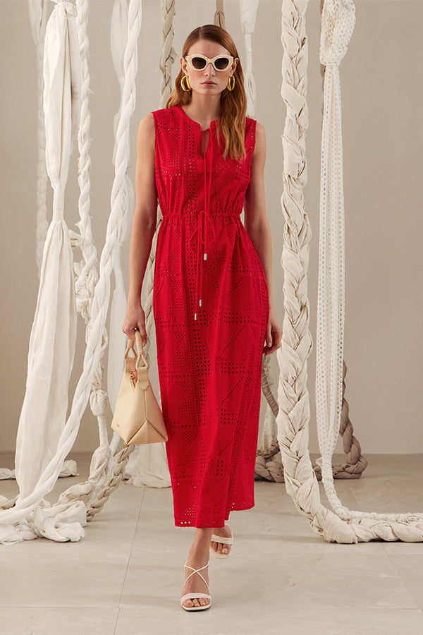 Vestido largo de algodón bordado con escote redondo y abertura acabada en pico. Cierre en cuello mediante lazada y cintura ajustable mediante cordón.