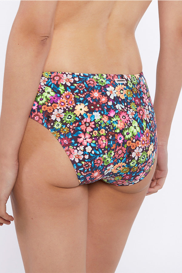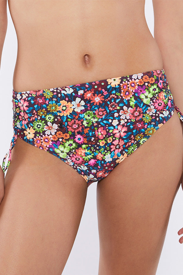 Bottom de bikini con estampado de flores de colores sobre un fondo color vino, Los lazos laterales permiten graduar el ajuste a la cadera y ofrecer la máxima cobertura.