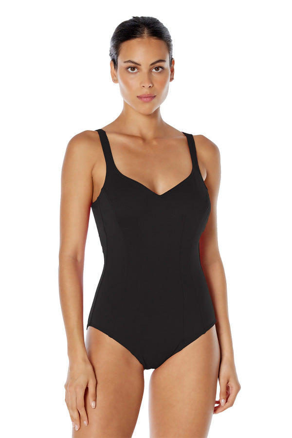 Bañador con relleno y sin aro en copa B. Lleva tirantes regulables a la espalda y va todo forrado. Su particular diseño de doble costura vertical, ayuda a reducir y moldear la figura. Un clásico que no pasa nunca de moda.