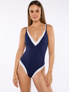 Bañador basico cuello en "V" de línea lisa bicolor con efecto de llevar dos prendas superpuestas. Disponible en dos combinaciones diferentes para mujeres con poco pecho