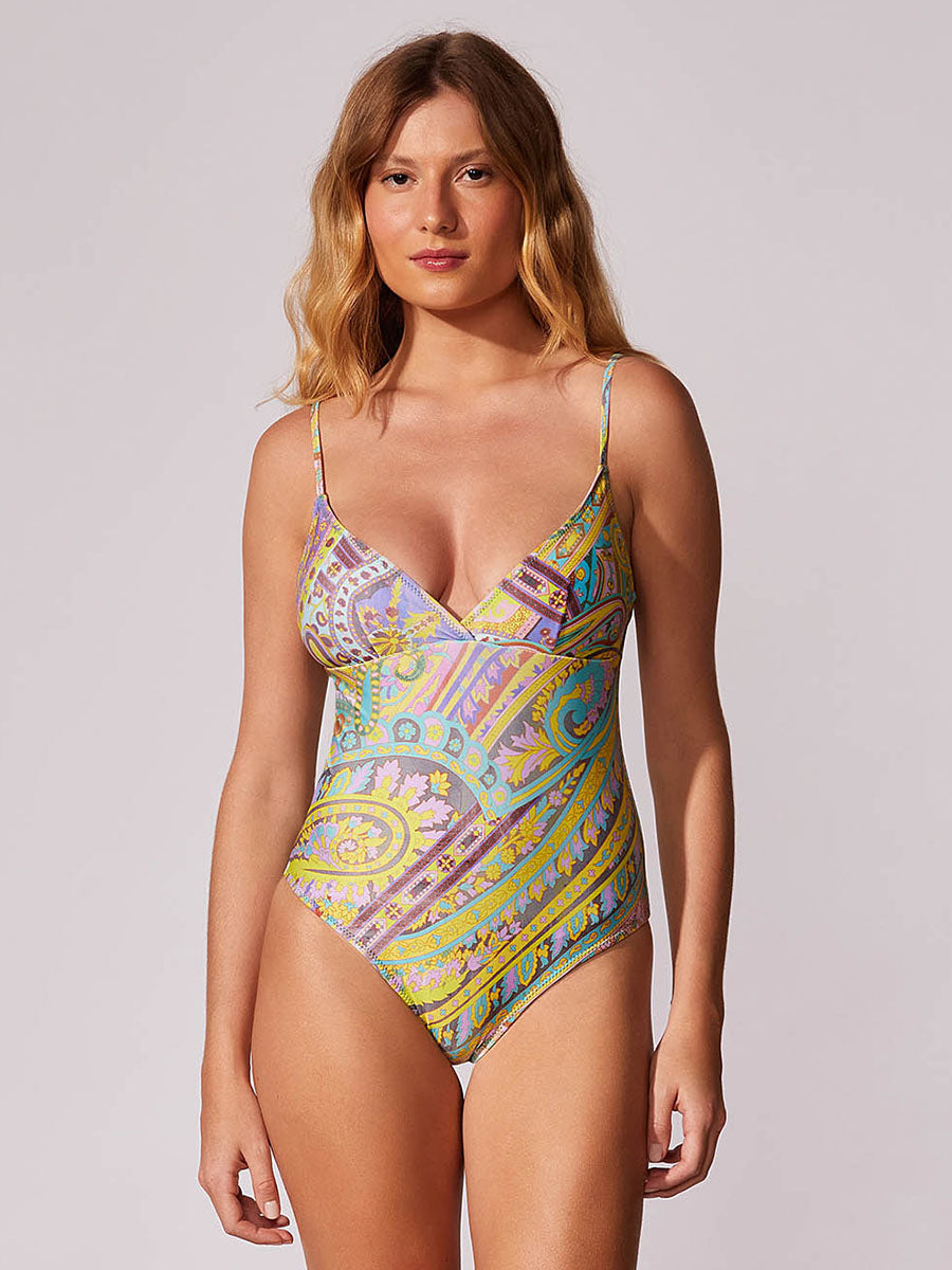 Bañador básico estampado. Escote en forma de triángulo, tirantes fijos con ajuste. Aro removible. Tejido: Microfibra Beach