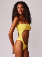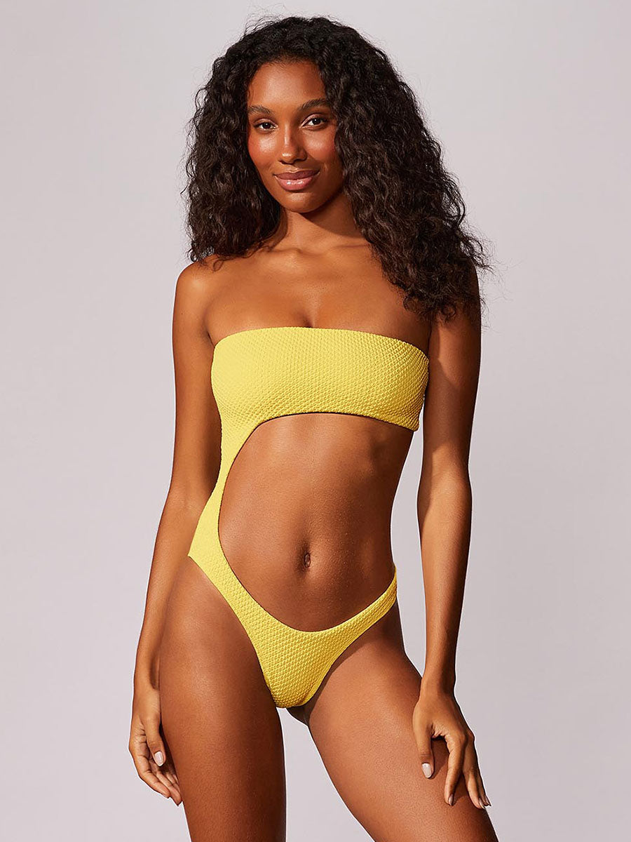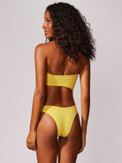 Trikini media copa liso con aro para mayor sujeción, cierre de imán en la espalda, tirantes ajustables y detalles de metal en baño Oro Viejo. Copa removible. Tela: Microfibra Beach con textura