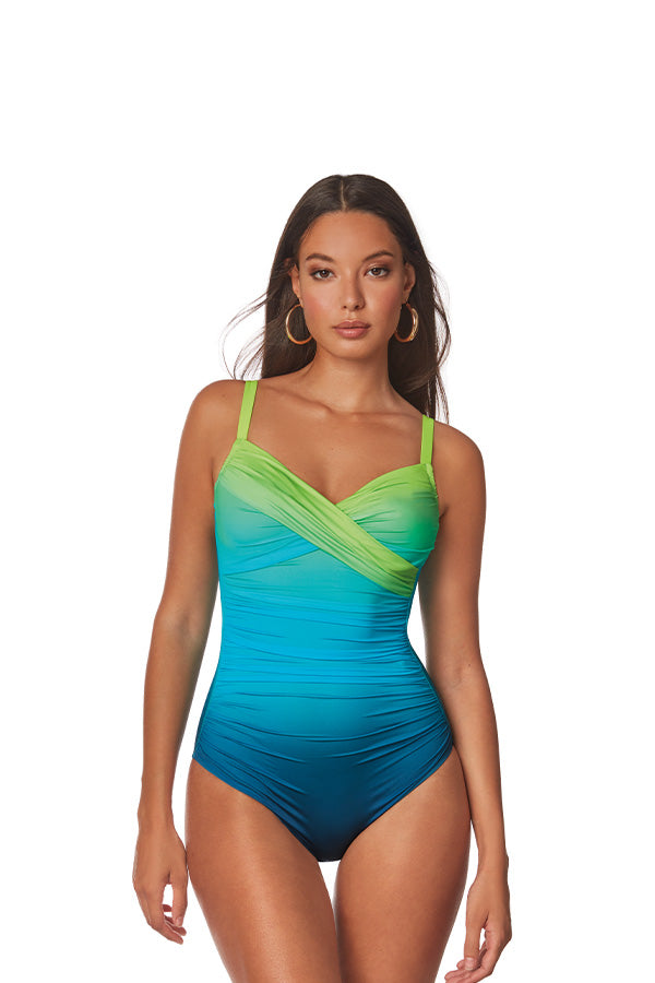 Bañador cuello en "V", copa suave. tirantes delgados regulables, con detalle de cruce en la parte del busto.
