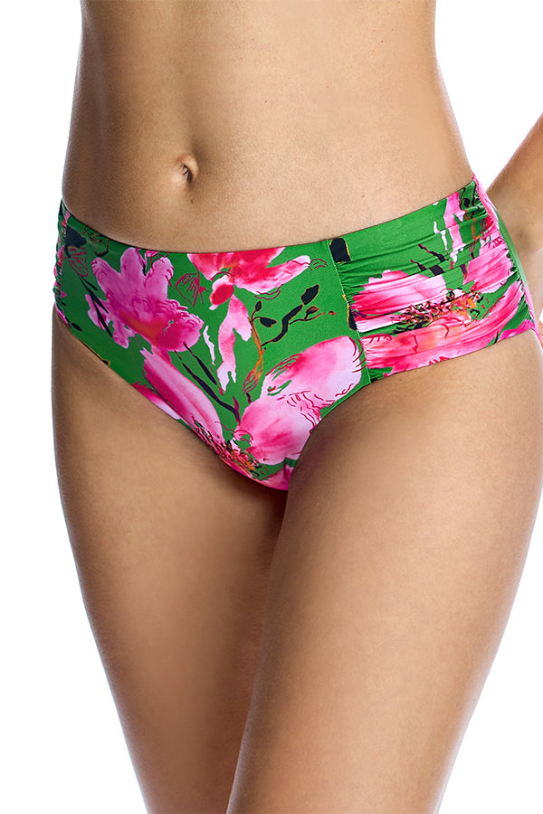 Bottom de bikini costado más alto con estampado floral verde y fucsia. Completamente forrada. Tejido de vanguardia con un alto poder moldeador, con una alta resistencia al cloro, cremas y aceites bronceadores y excelentes propiedades de absorción de la humedad.