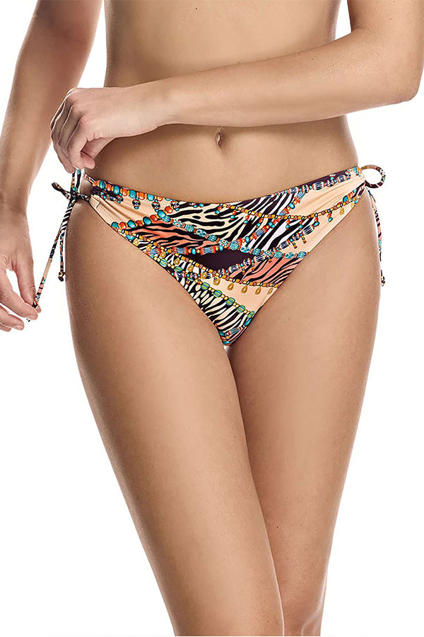Bottom de bikini básica con estampado animal print en tonos granates. Lazos laterales regulables. Completamente forrada.