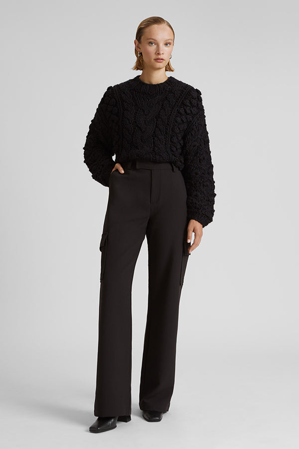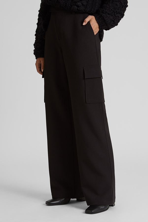 Pantalón largo de tiro alto. Cinturilla con trabillas, cierre mediante cremallera oculta por tapeta y botón interior. Bolsillo francés en laterales y de plastón con cartera en perneras. Bolsillo de vivo en parte trasera.
