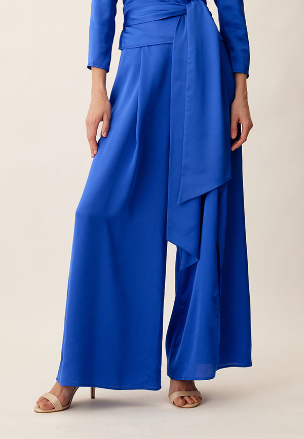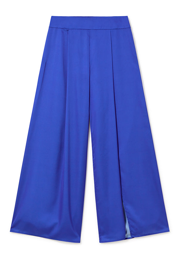 Pantalón palazzo con pinzas y abertura en pierna izquierda, cinturilla ancha y cremallera invisible lateral.