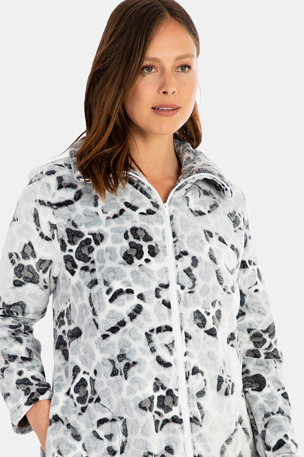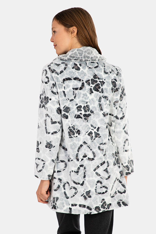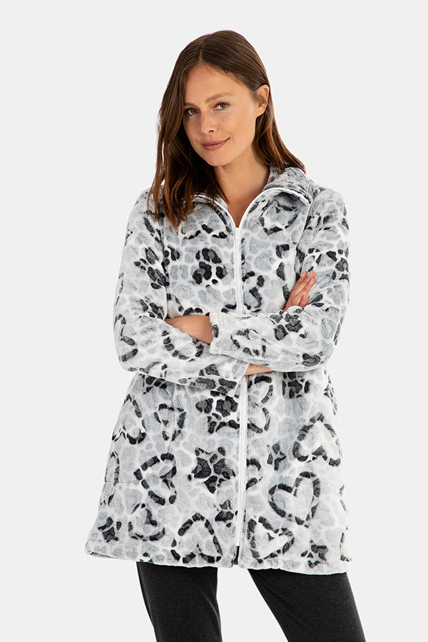 Chaqueta con cremallera con cierre hasta arriba del cuello, en color de fondo gris con estampado de corazones y animal print. Muy calentita, cómoda y juvenil para estar por casa.