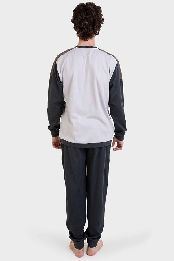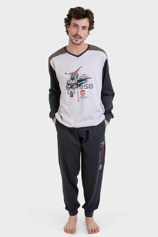 Pijama largo de punto en color crudo. La camiseta tiene el cuello pico y un estampado centrado de un avión. Las mangas son a contraste y detalle de pieza a contraste en los hombros. Pantalón liso en gris oscuro con puños y cintura para ajustar, detalle de estampado en el lateral.
