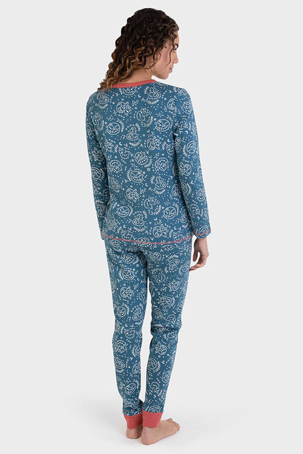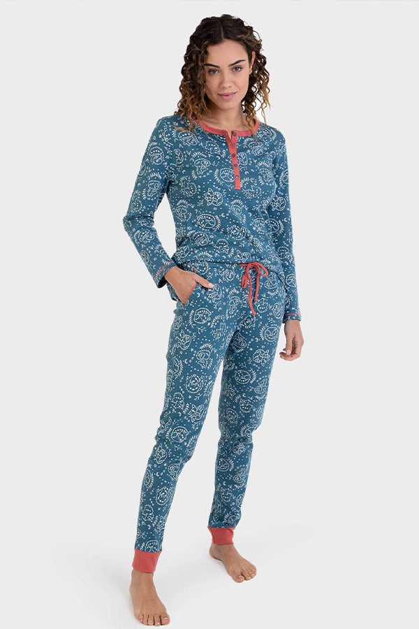 Pijama largo de punto en color crudo. La camiseta tiene el cuello pico y un estampado centrado de un avión. Las mangas son a contraste y detalle de pieza a contraste en los hombros. Pantalón liso en gris oscuro con puños y cintura para ajustar, detalle de estampado en el lateral.
