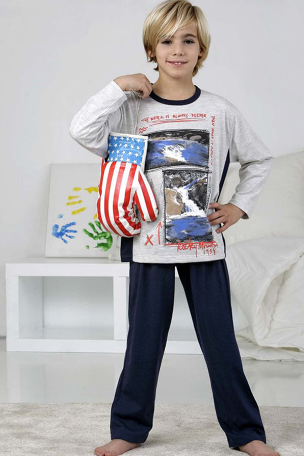 Pijama de niño compuesto por camiseta manga larga y cuello redondo . Pantalón larg con cintura ajustable.