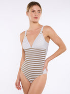 Bañador sofisticado y moderno de escote en pico Foam extraíble, diseñado para brindarte un ajuste perfecto y un soporte excepcional. Los tirantes regulables permiten personalizar el confort, mientras que el tejido rayado con lurex, combinando colores positivos y negativos en tonos blanco y negro, crea un efecto visual impactante. Las anillas doradas de adorno añaden un toque de lujo y distinción, elevando el diseño a un nivel de elega