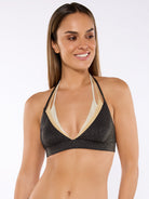 Luce un estilo sofisticado y elegante con este sujetador de bikini Top Especial, diseñado para realzar tu figura con un toque de lujo. Los tirantes atados al cuello ofrecen un ajuste personalizado, brindándote comodidad y soporte. El tejido brillante en tonos negro, ocre y crudo crea una combinación armoniosa que refleja un aire moderno y refinado.