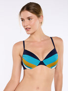 Top de bikini con aros y foam en copa C es la opción ideal para quienes buscan un ajuste perfecto y un soporte excepcional. Su contorno y tirantes graduables te permiten personalizar el ajuste para mayor comodidad y seguridad. El tejido de pique rayado en tonos azules y ocre aporta un toque moderno y sofisticado, convirtiéndolo en una prenda elegante y con estilo para tu tiempo de baño.