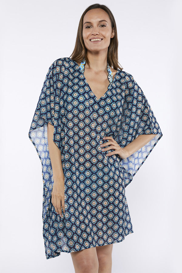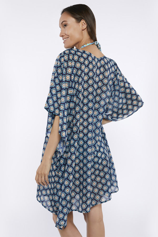 Caftán de estampado setentero simulando la tendencia de azulejos en tonos azules. Complementa los bañadores y bikinis de la línea Batam.