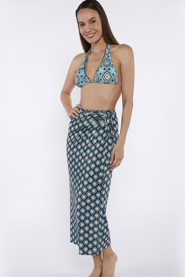 Falda de estampado setentero simulando la tendencia de azulejos en tonos azules. Complementa los bañadores y bikinis de la línea Batam.
