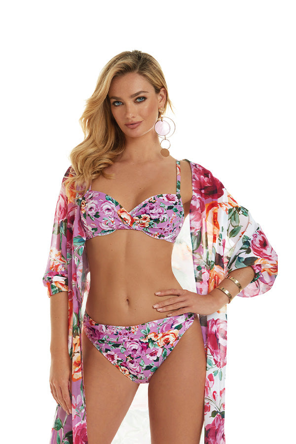 Bikini de dos piezas, corte favorecedor para dar soporte hasta en las tallas más grandes. Su aro y corte entrelazado realza el busto de forma natural además de ofrecer una alta sujeción. Interior y lateral forrado de tul con soporte de media luna y tirante regulador que aumenta su ancho en función de la talla, adaptándose a ti. A juego con braga básica de corte alto y lateral ancho para un mayor confort.