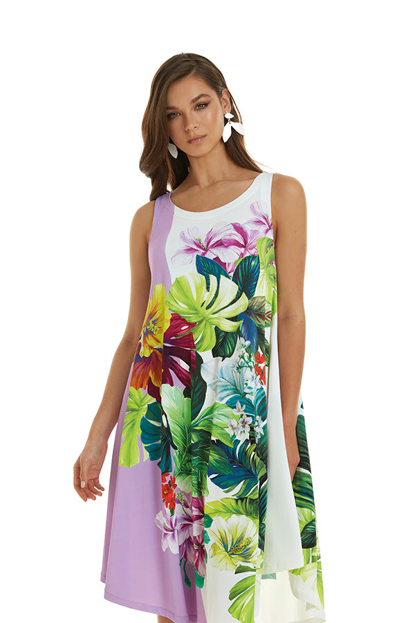 Vestido de playa, sin mangas, cuello redondo estampado floral.