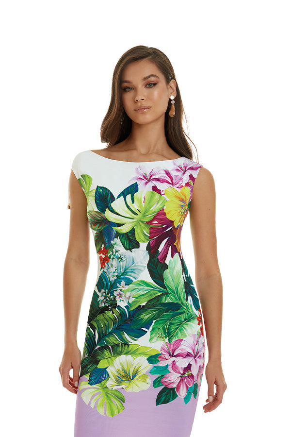 D: Vestido de playa, manga cero, cuello tipo ojal, estampado floral.