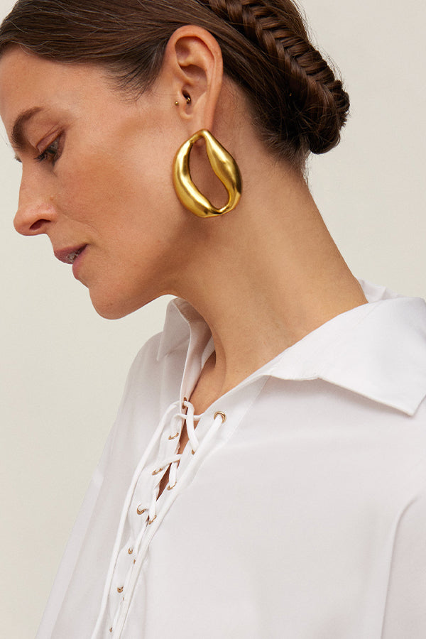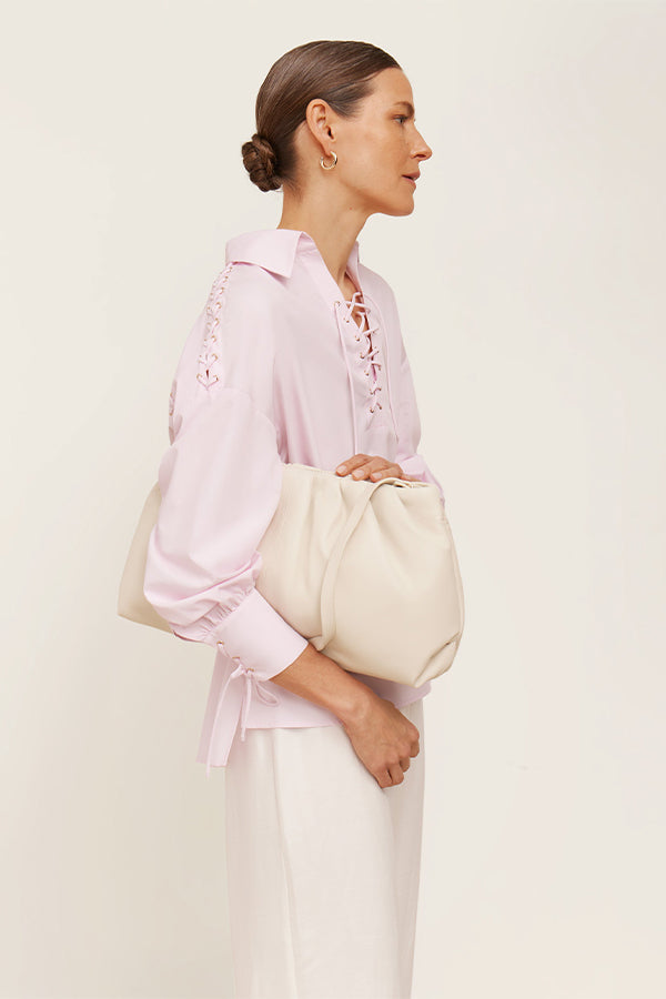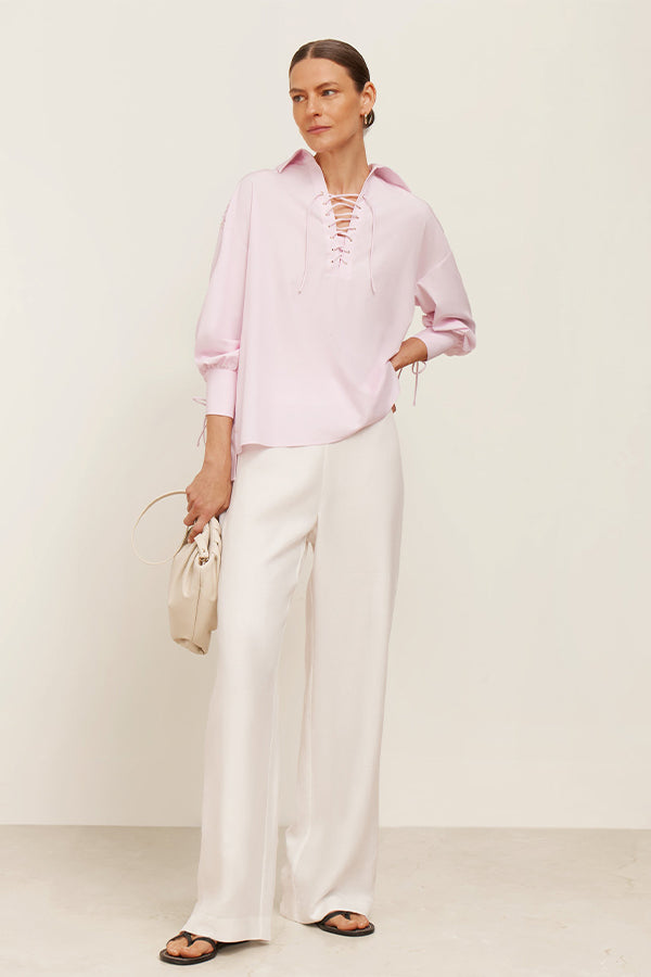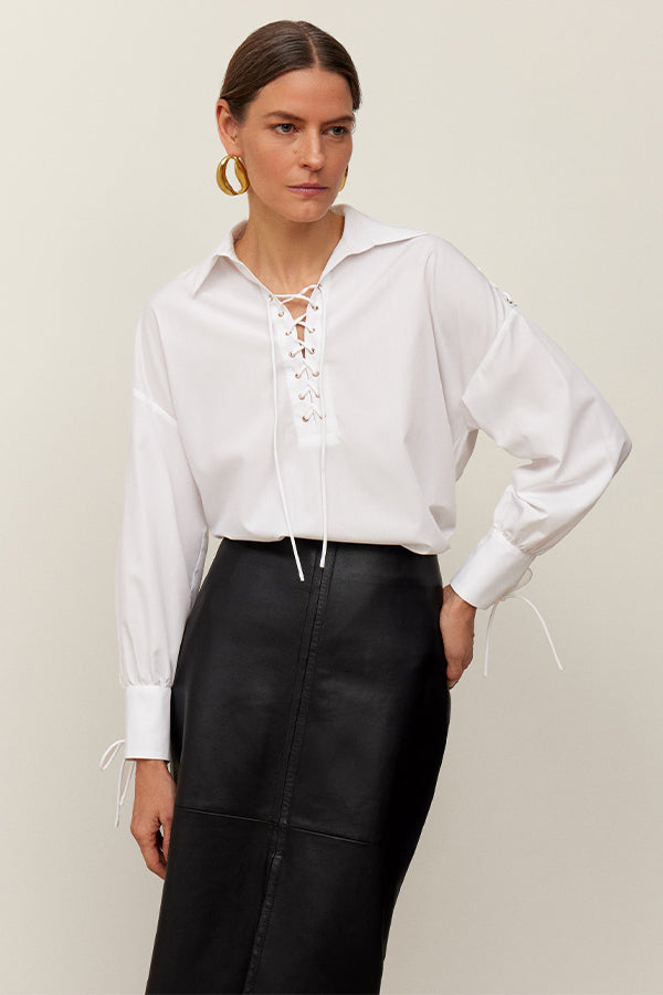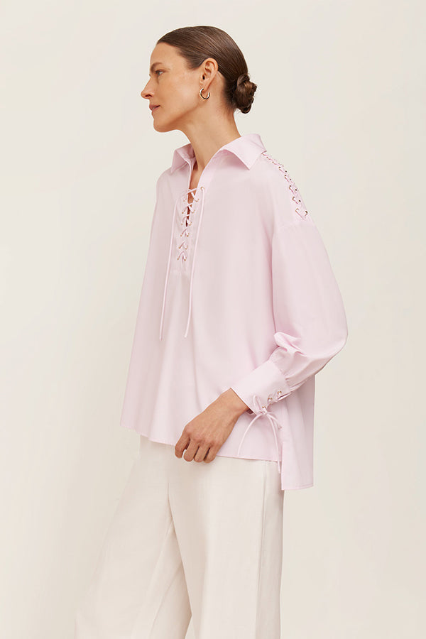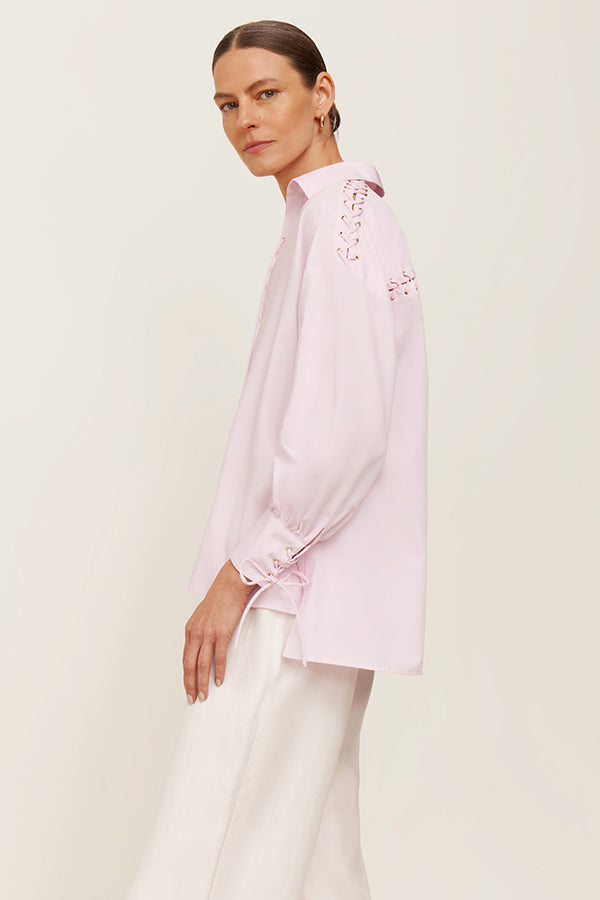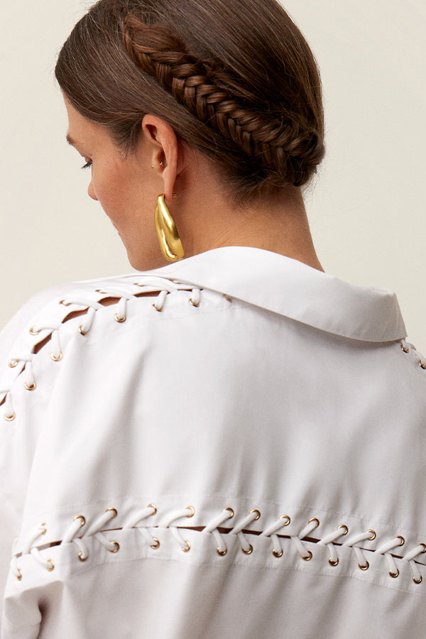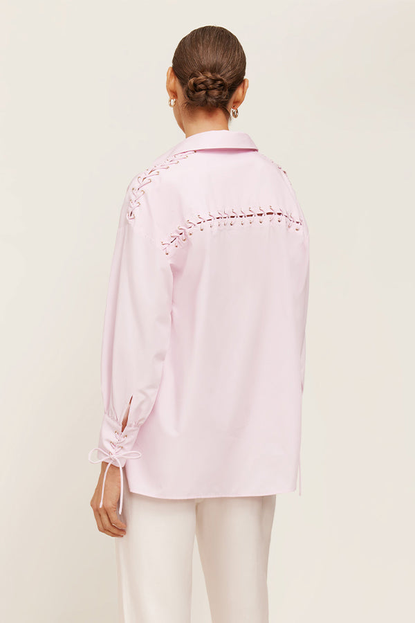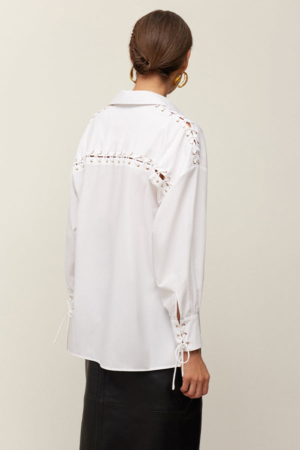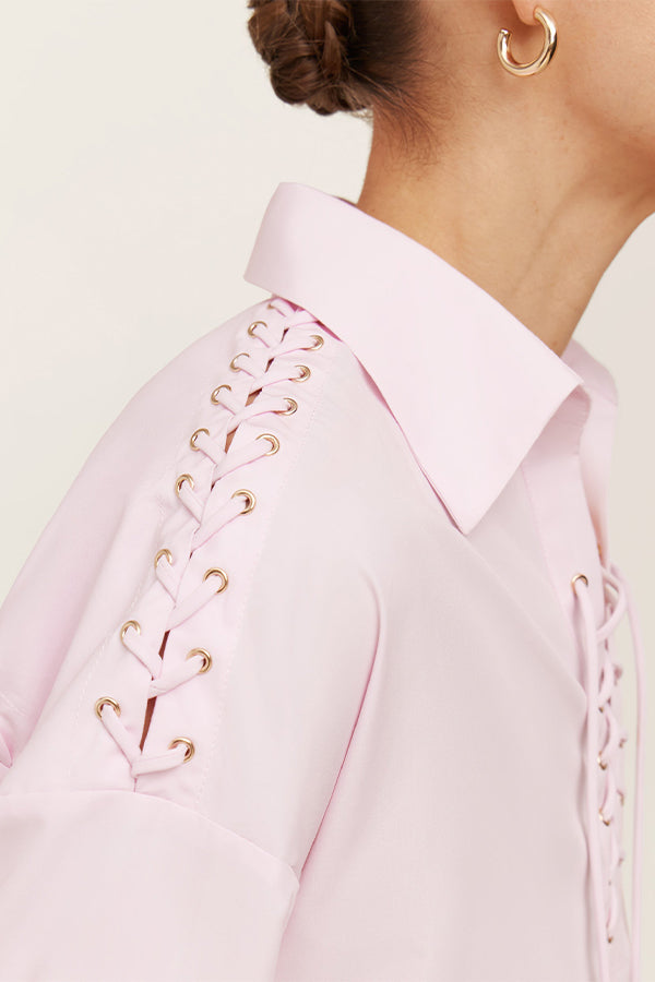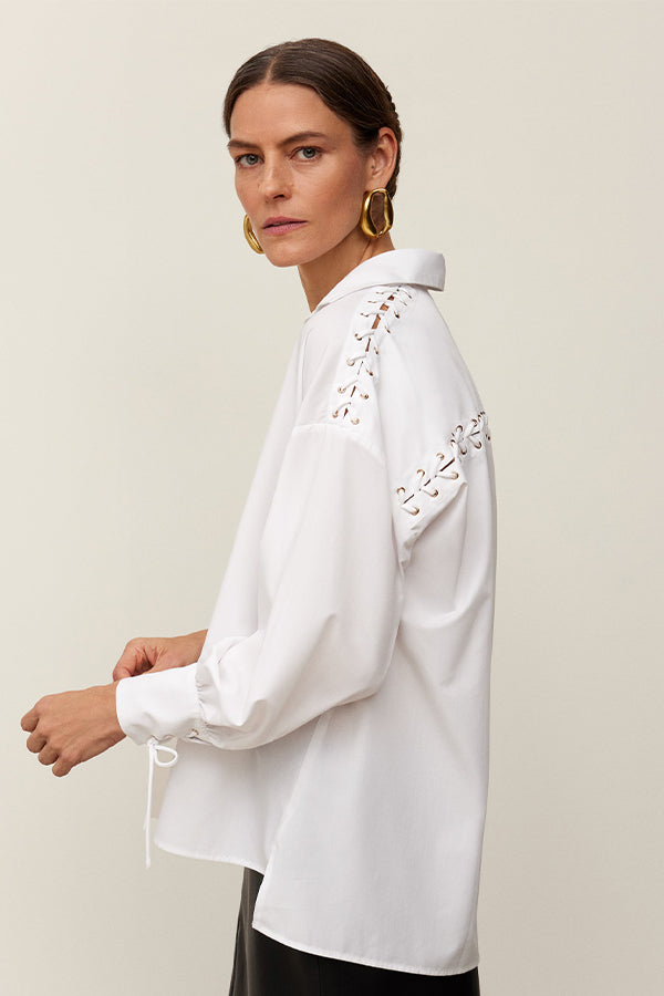 Camisa con cierre mediante eyelets y lazada. El mismo detalle se repite en hombros y puños.