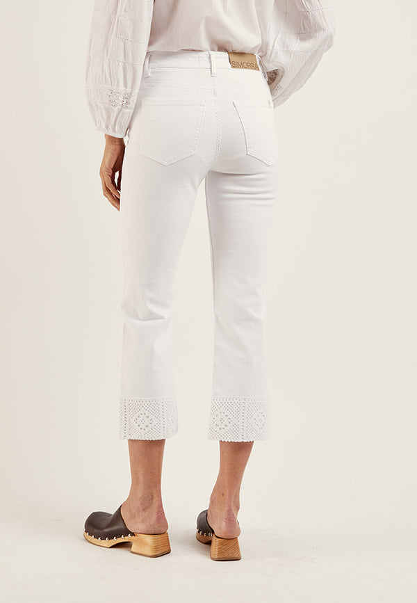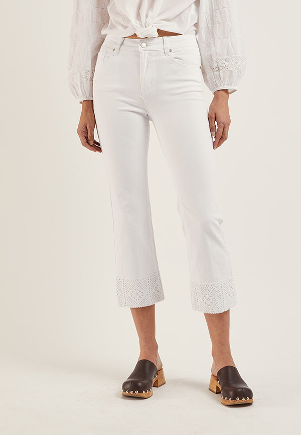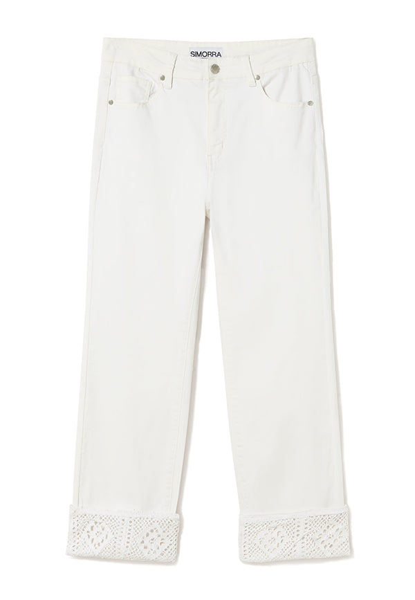 Pantalón denim crop de algodón acampando con bajo tejido de fantasía.