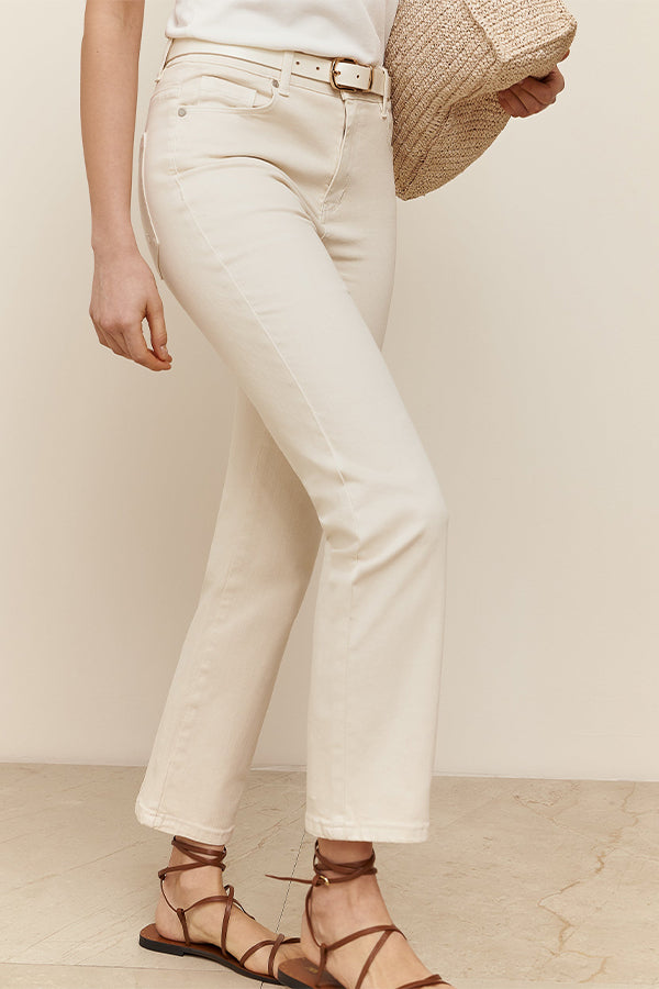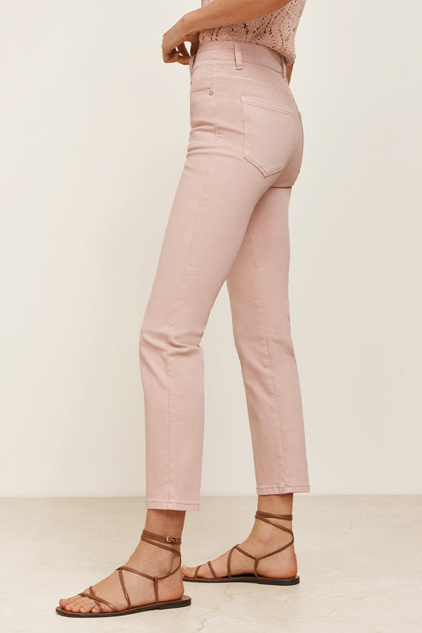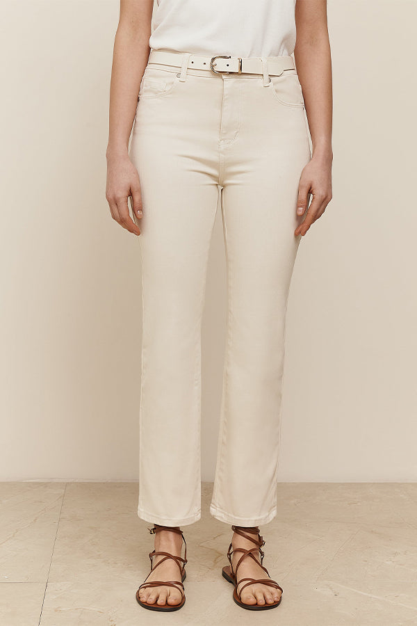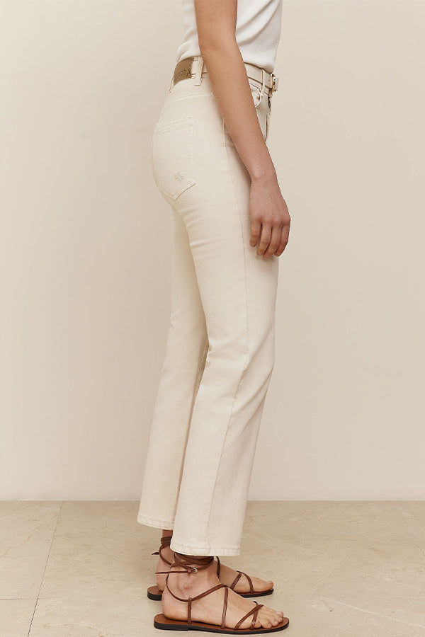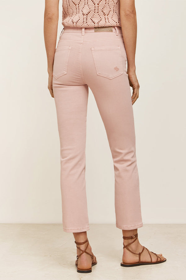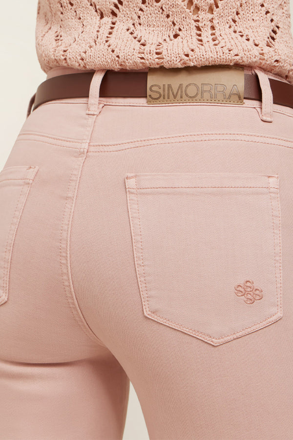 Pantalón de sarga de algodón cinco bolsillos de corte slim. Cierre mediante cremallera oculta por tapeta y botón. Trabillas para el cinturón.