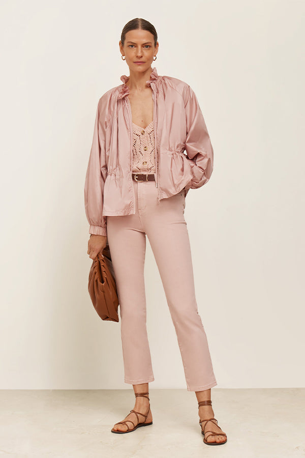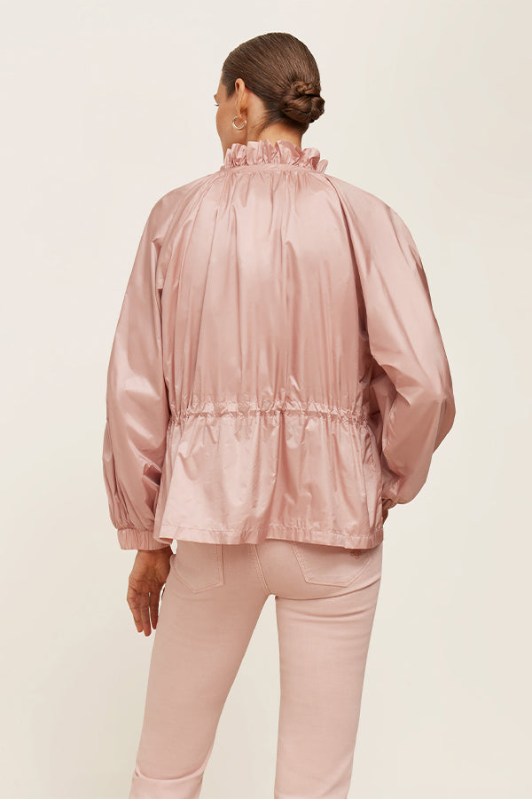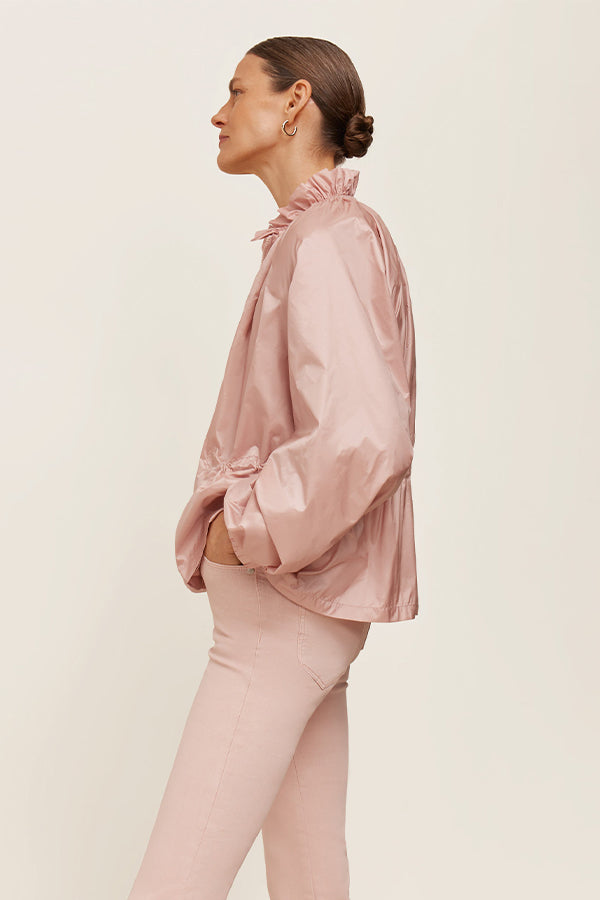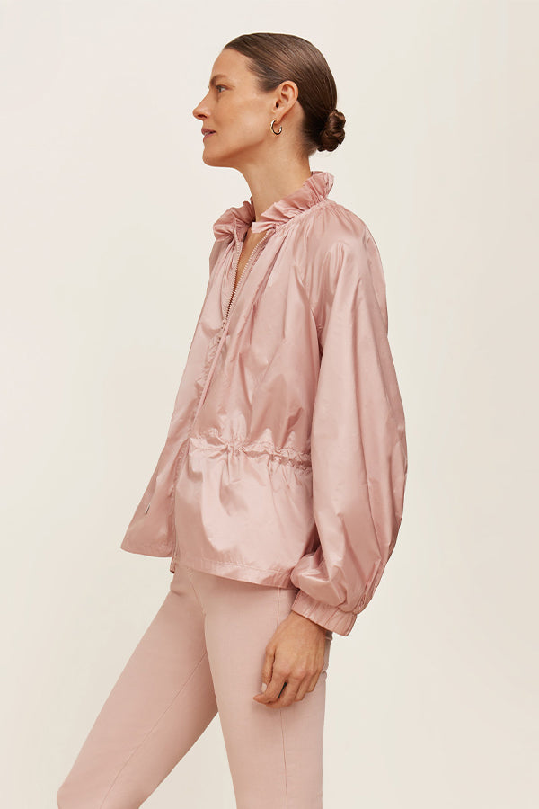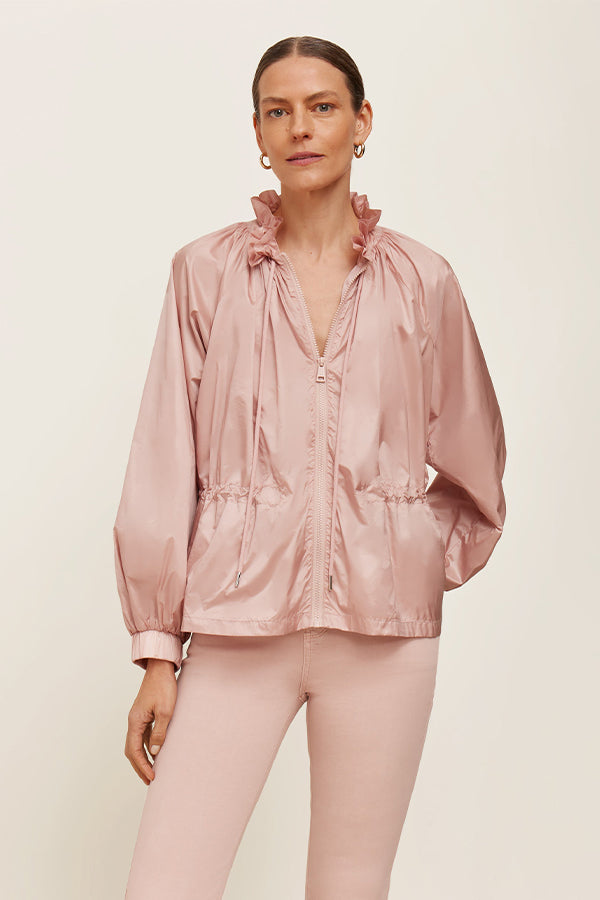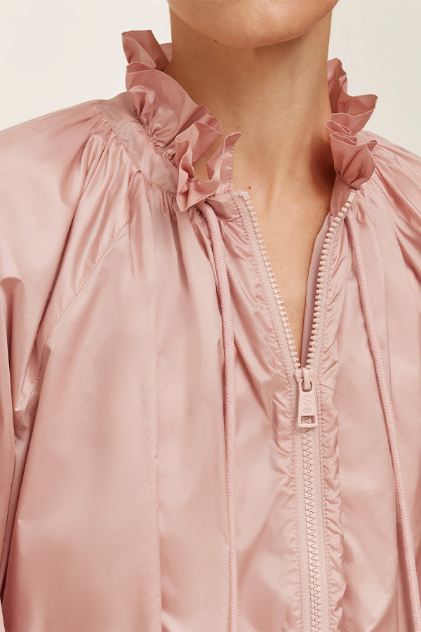 Parka corta ultra ligera con volante en el cuello. Manga ranglan fruncida acabadas con puños de goma. Bolsillo de parche en el interior. Ceñidor en cintura en el interior. Cierre mediante cremallera.
