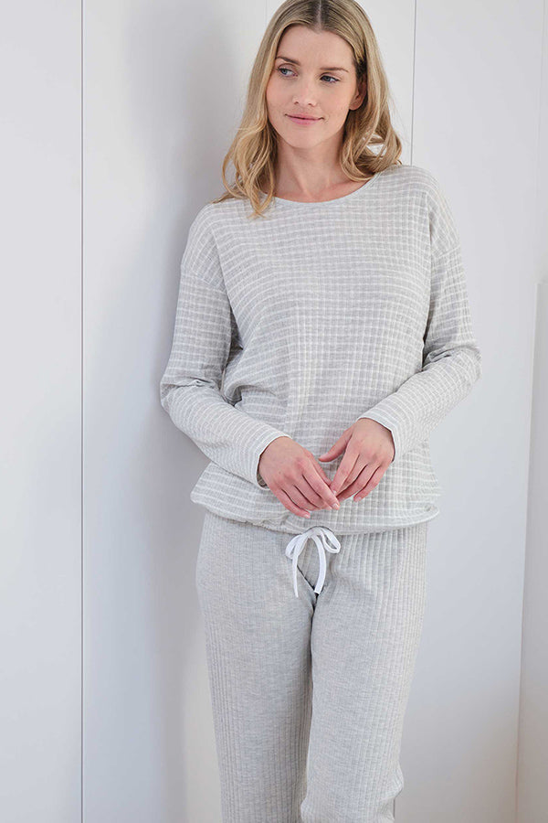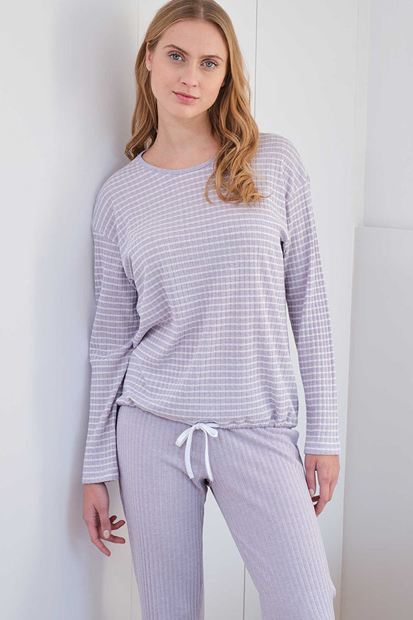 Pijama de mujer, compuesto por camiseta con tejido desagujado listado. manga larga, cuello redondo y tira de ajuste en bajo. Pantalón largo en tejido desagujado liso y goma en cintura