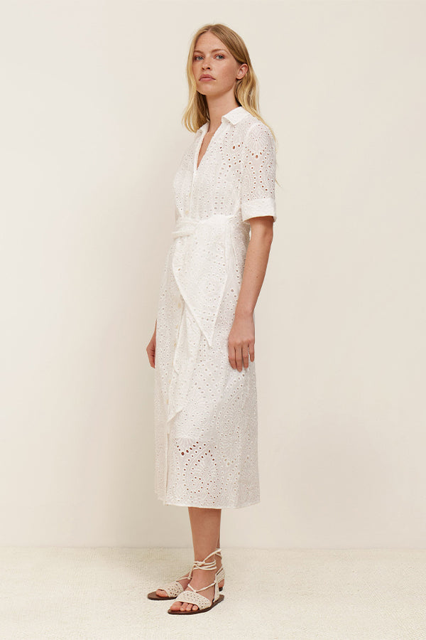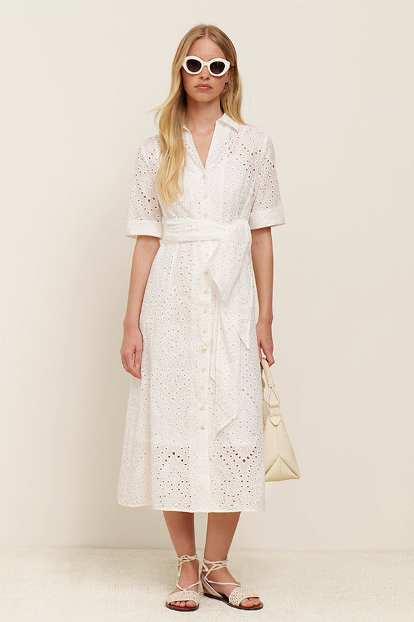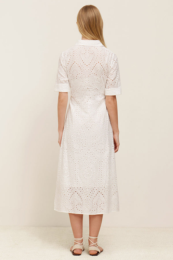 Vestido camisero de algodón bordado con cuello camisero y escote pico. Manga corta. Cierre mediante botonadura frontal.