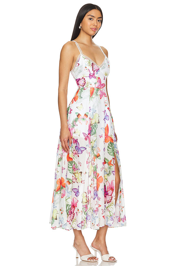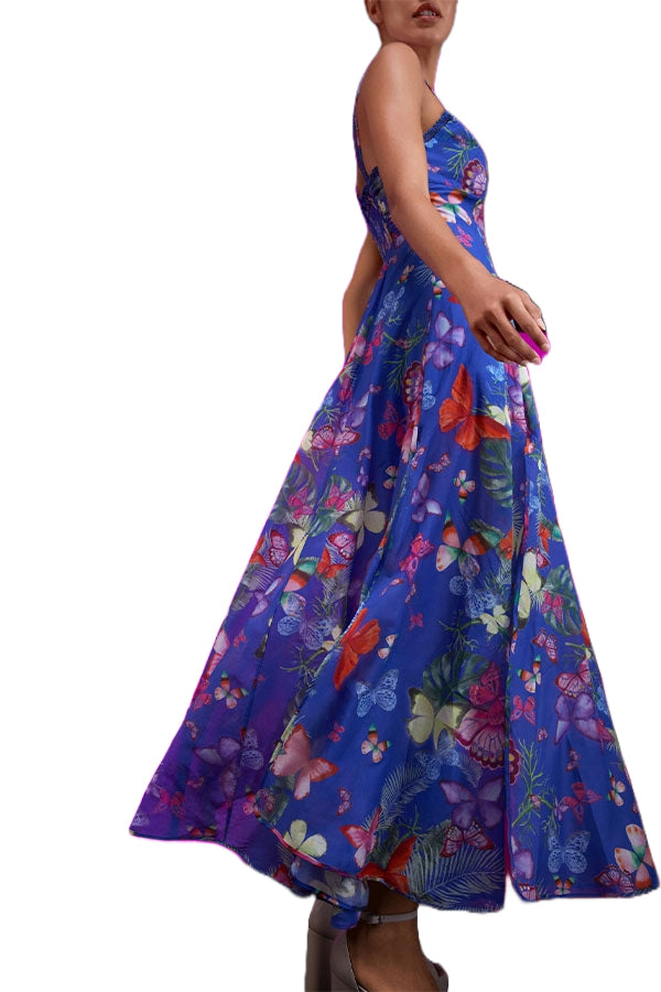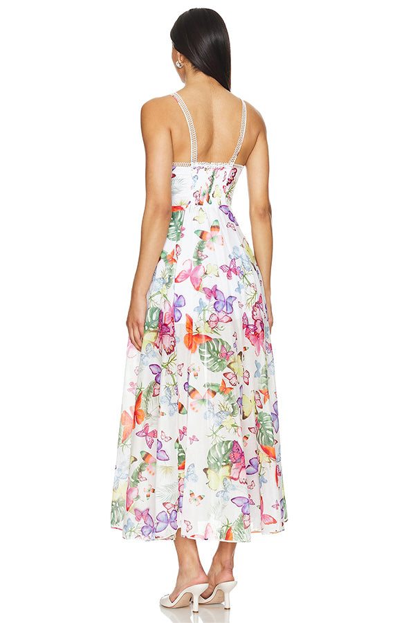 El vestido de algodón Iraso es una pieza "effortless" para sentirte bella en cualquier ocasión de la temporada. Con escote en pico adornado con guipures geométricos y tirantes espagueti, la femenina silueta juega con una larga y sinuosa falda estampada por motivos primaverales previamente hechos a mano.