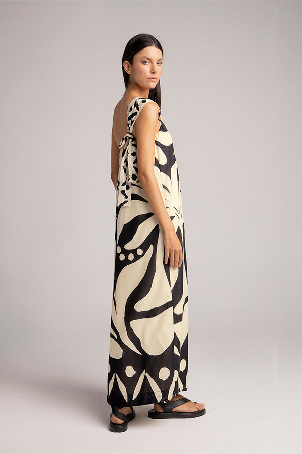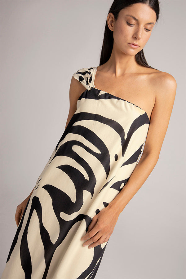 Vestido de un solo hombro con manga caída y detalle de lazo en la espalda.
