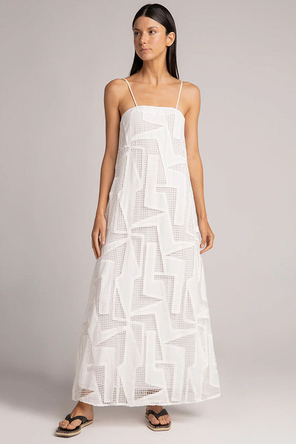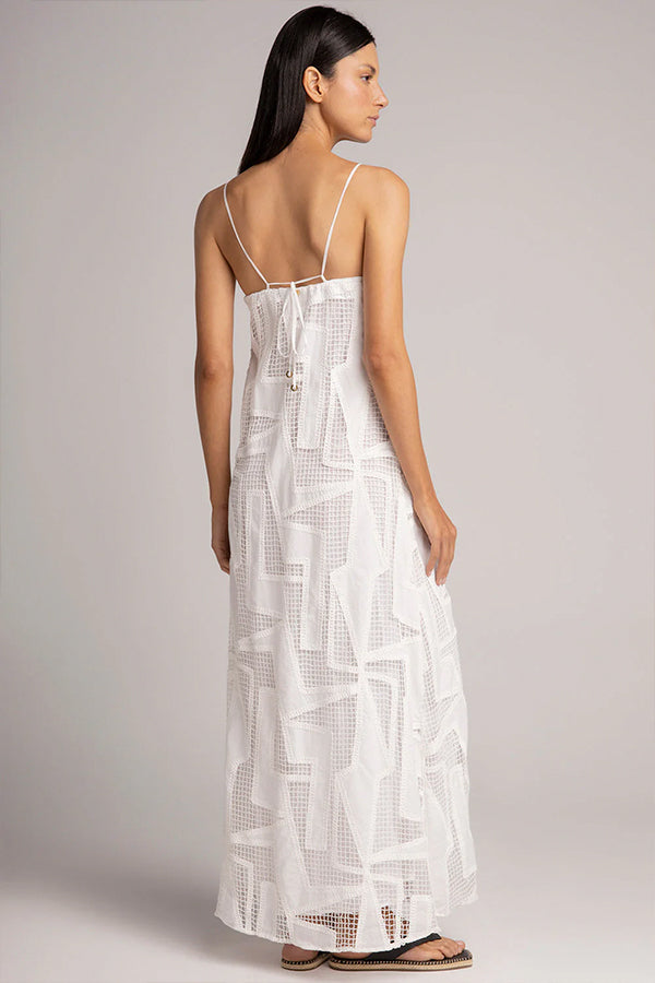 Vestido largo de trabajo abierto con tirantes finos ajustables en los extremos dorados y cremallera lateral
