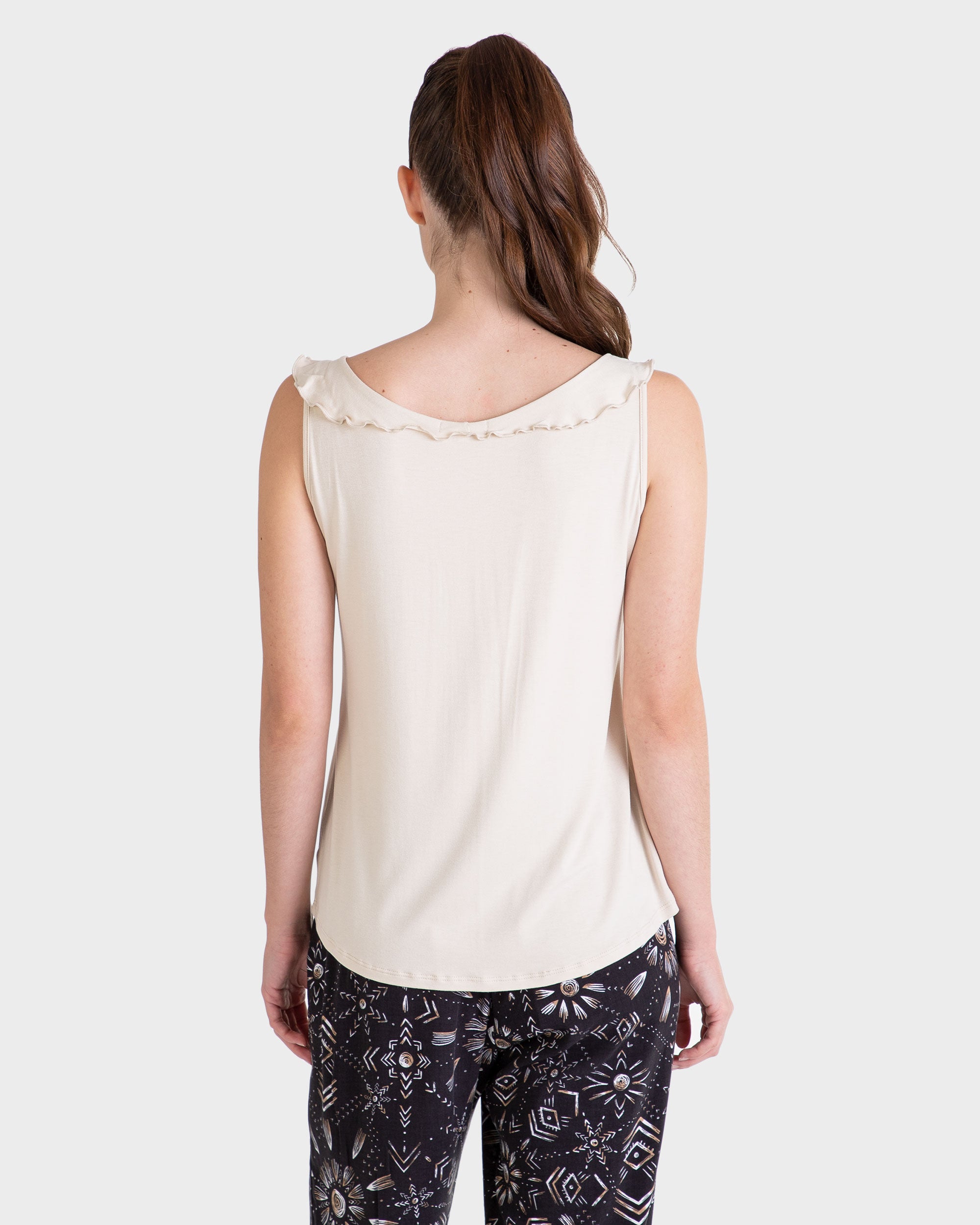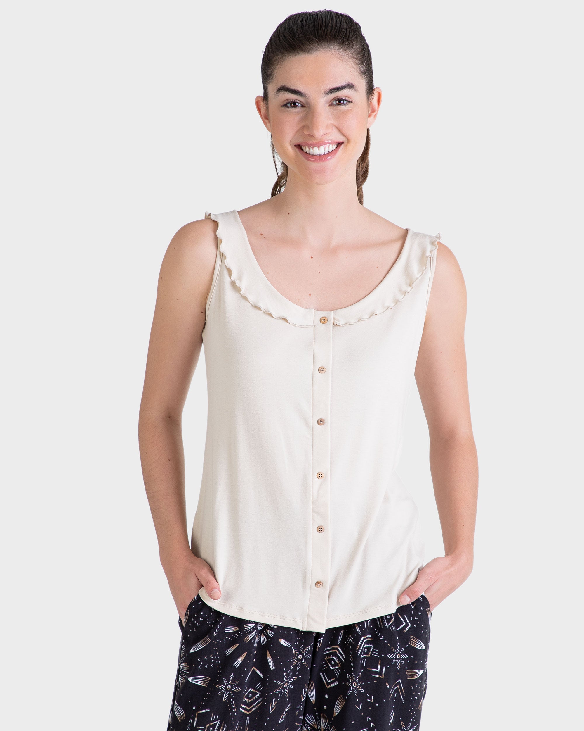 Blusa sin mangas, cuello redondo y volantes y falso botones delantero.