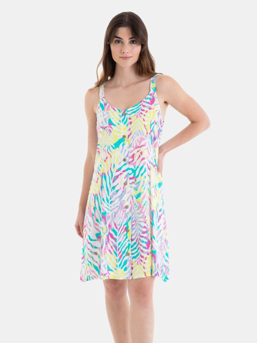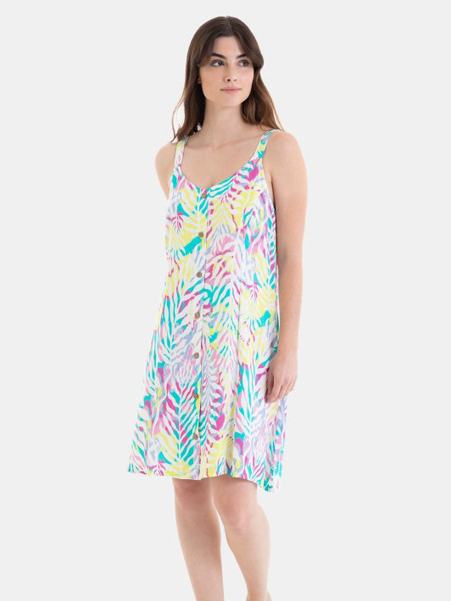 Vestido de mujer en tejido de tela de viscosa, de tirantes y botones delanteros