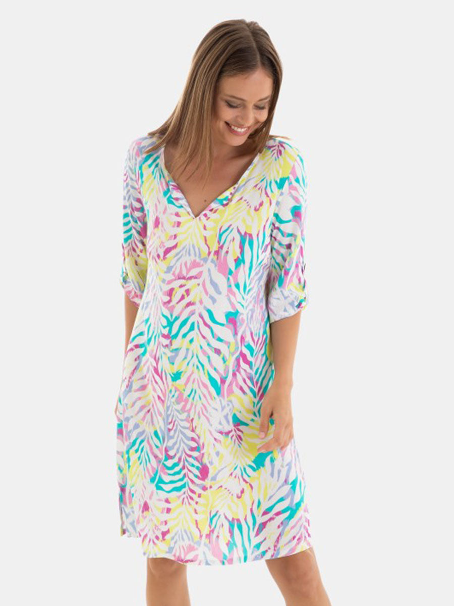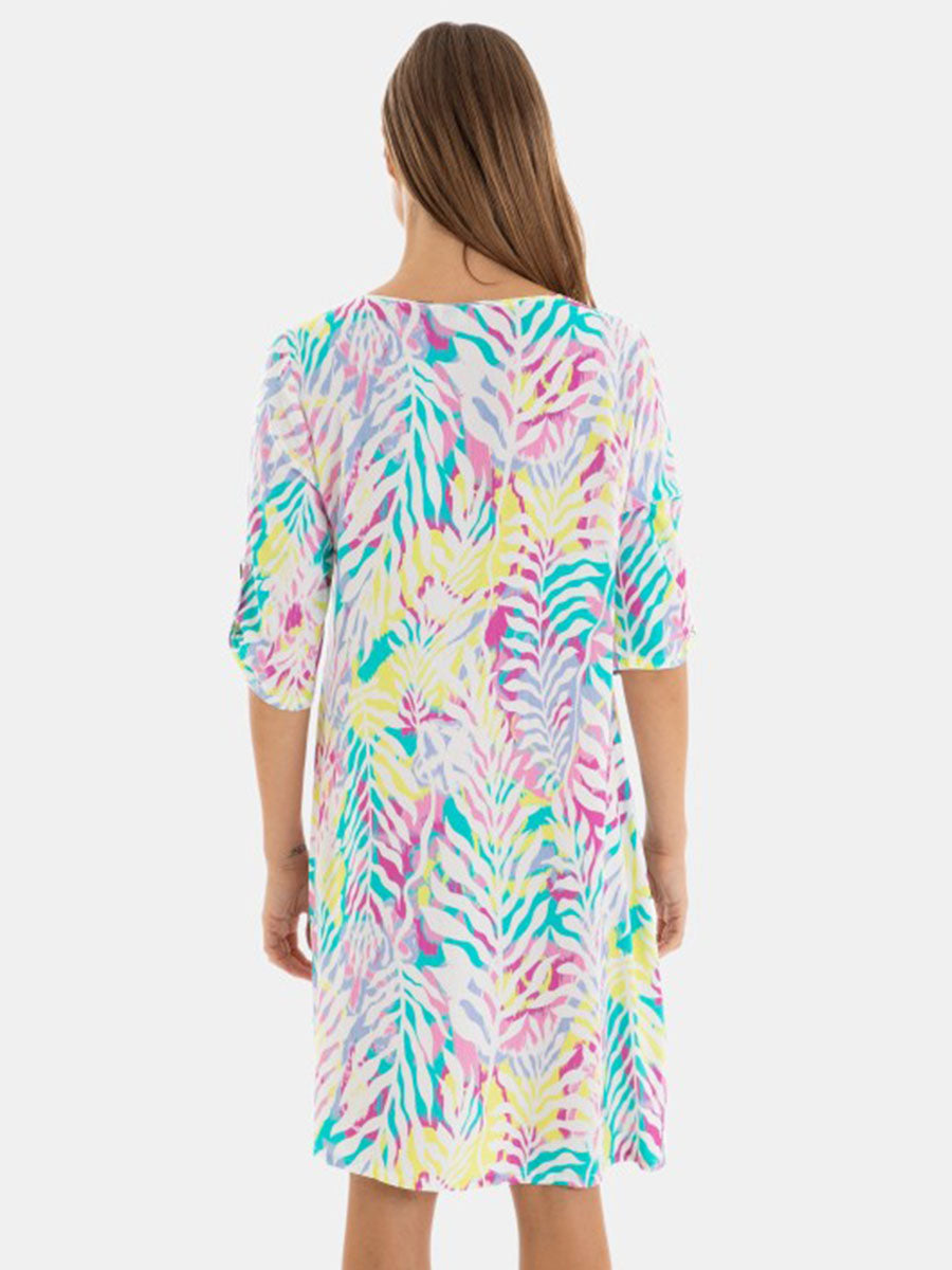 Vestido de mujer en tejido de tela de viscosa, de manga 3/4 con detalle de tira recogida con botón, cuello redondo acabado en "V".
